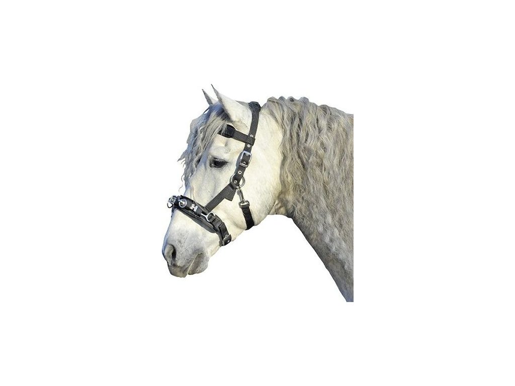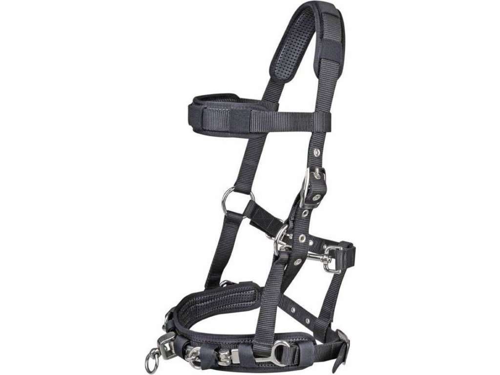 Wysokiej jakości kawecan do lonżowania z miękką wyściółką na nagłówku, nachrapniku i pasku potylicznym. Wyposażony w okucia w srebrnym kolorze. Jest regulowany w trzech miejscach. Dostępny w kolorze czarnym oraz w rozmiarach PONY, COB i FULL.