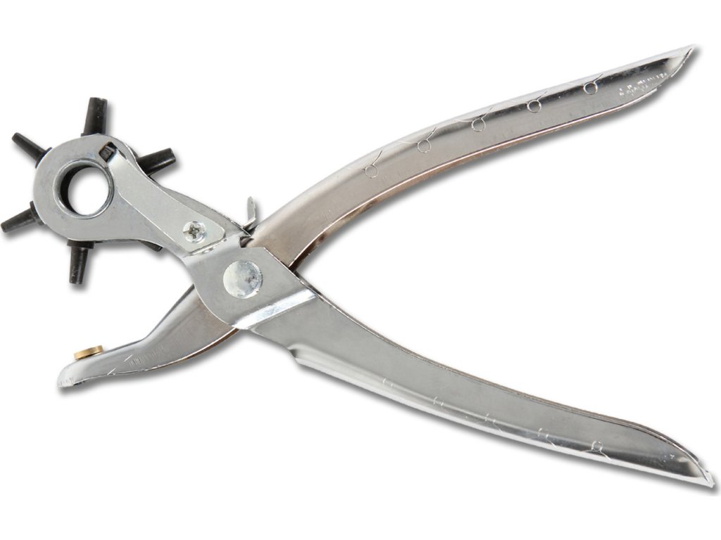 Metalowy dziurkacz do skóry w formie szczypiec. Szczególnie odpowiedni do delikatnej, cieńszej skóry. Sześć rozmiarów otworów. Nie nadaje się do grubej, twardej skóry.