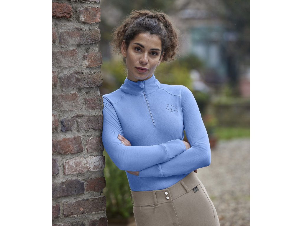Elegancki T-shirt z długim rękawem wykonany z oddychającego i miękkiego materiału, który jest również delikatny dla skóry. T-shirt ma wysoki kołnierz i zamek błyskawiczny, który sięga do połowy T-shirtu. Ozdobiony jest emblematem marki ELT na piersi, który wykonany jest z dżetów. Jest dostępna w kilku wariantach kolorystycznych.