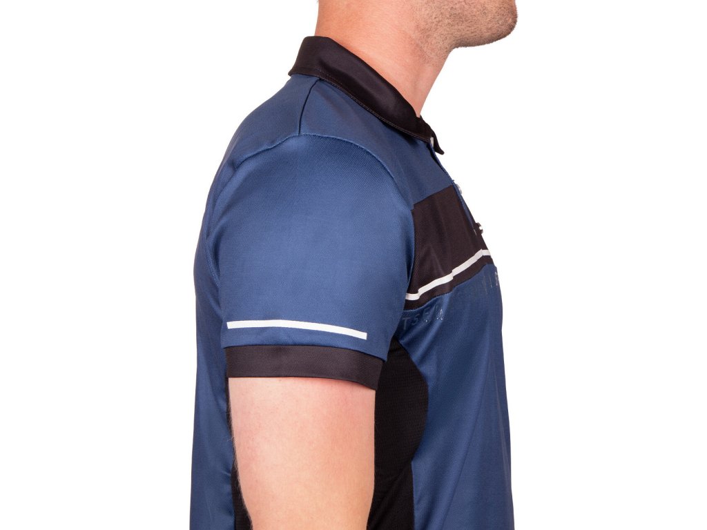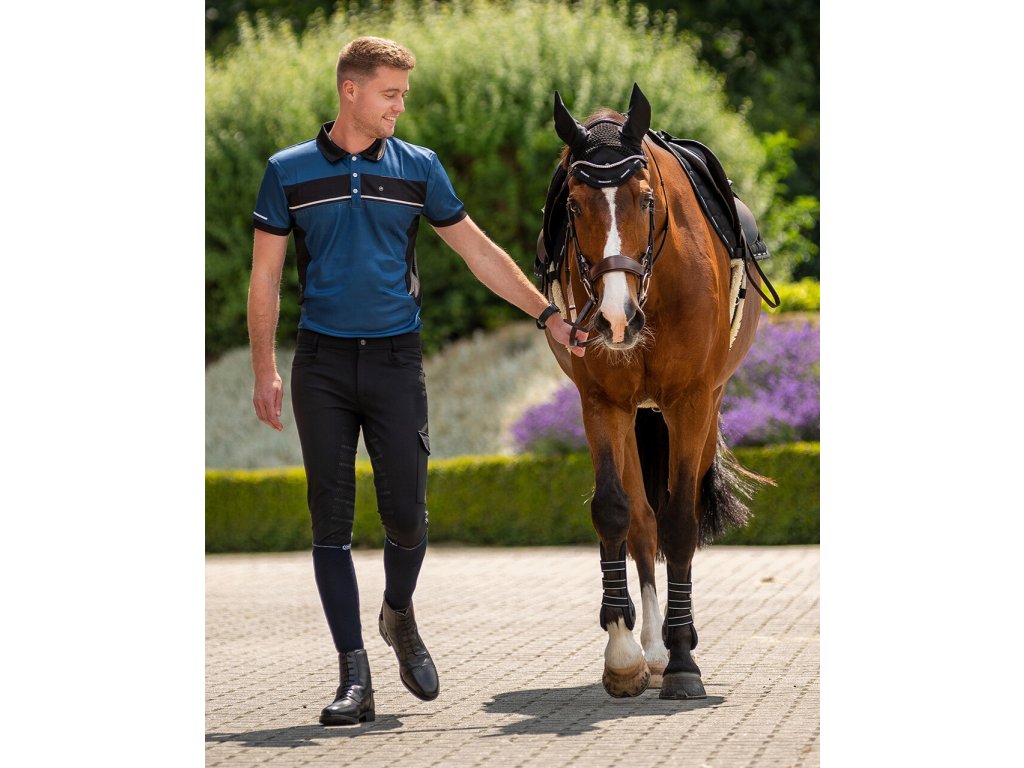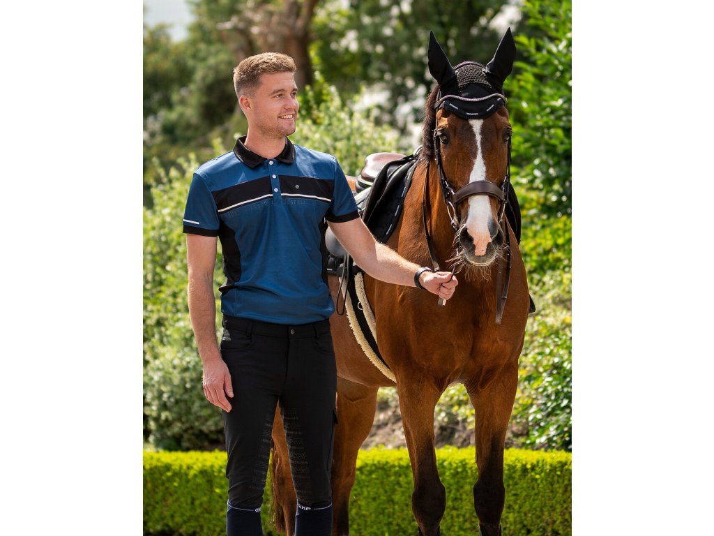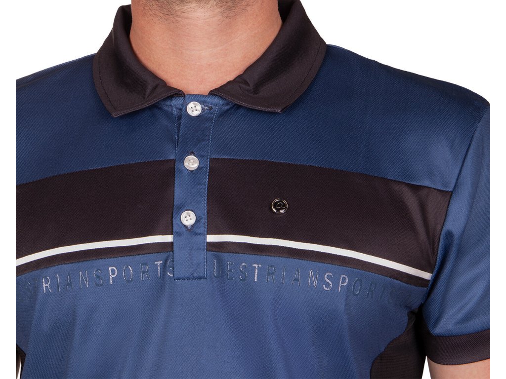 Wysokiej jakości męska koszulka sportowa odpowiednia na letnią pogodę. Wyposażona w siatkę po bokach, która jest wysoce oddychająca i zapewnia komfort. Ozdobiona napisem "Equestrian Sports" z przodu i małym logo Q na piersi. Połączenie koloru niebieskiego i czarnego nadaje sportowy wygląd. Dostępne również w rozmiarach dziecięcych. Część kolekcji wiosna/lato 2023.