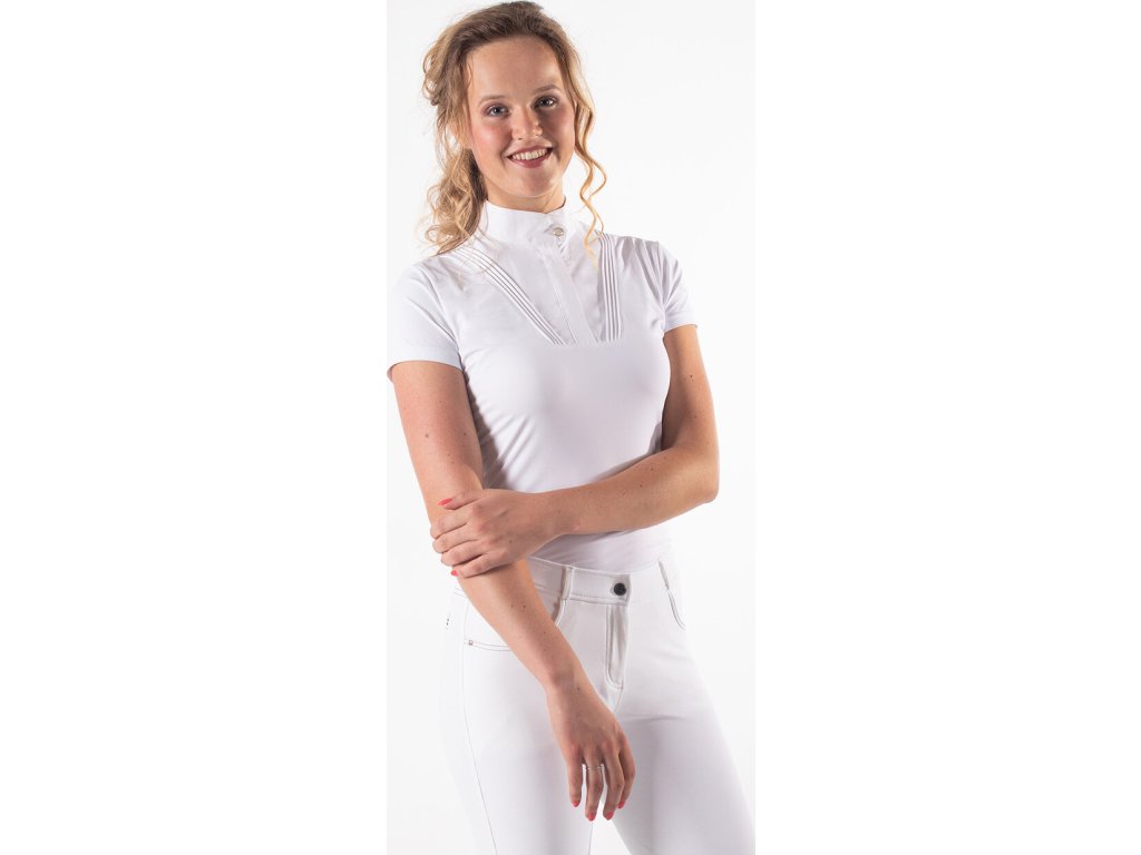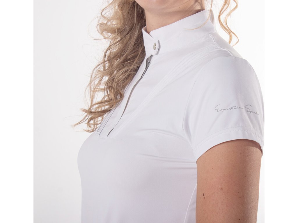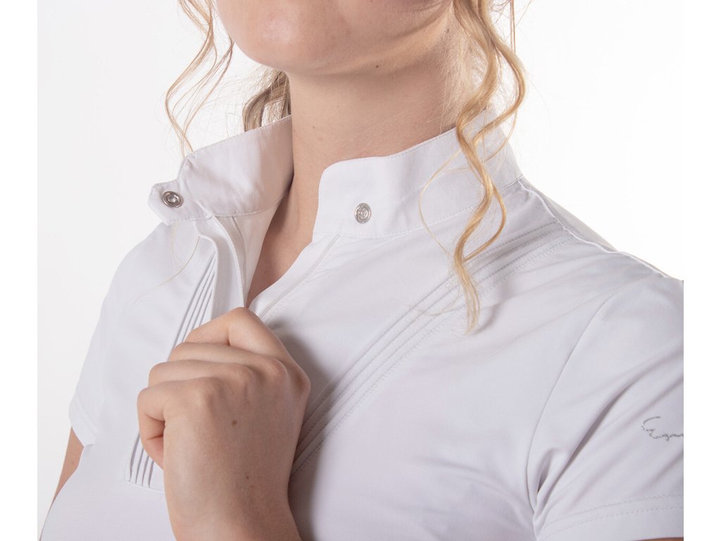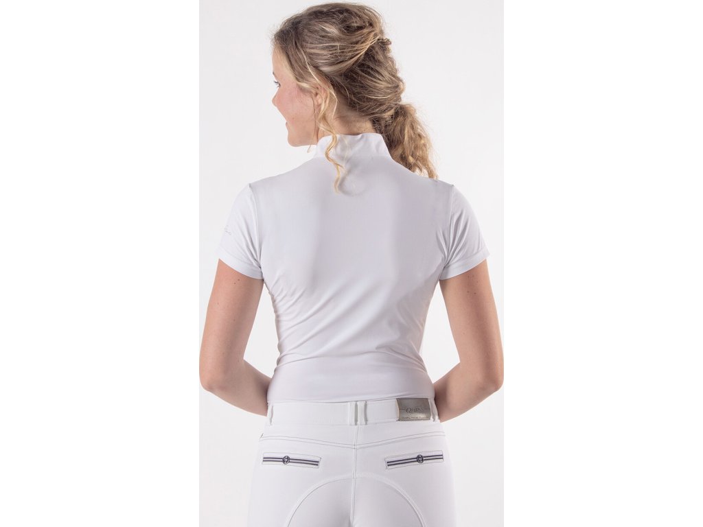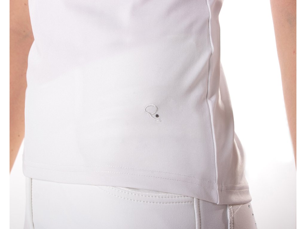 Sportowy T-shirt wykonany z elastycznego materiału, który jest odporny na promieniowanie UV. Posiada ukryty zamek błyskawiczny i zapięcie na guziki przy szyi. Posiada plisowany detal w kształcie litery V z przodu i jest ozdobiona srebrnym brokatem "Equestrian Sports" na lewym ramieniu oraz małym haftowanym emblematem "Q". Dostępna również w kolorze beżowym.