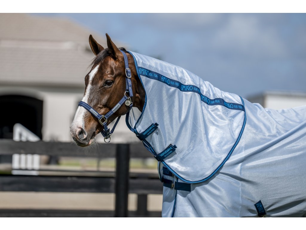 Nakrycie na szyję pasuje do derki Amigo Bug, zapewniając lepszą ochronę przed owadami i 65% ochronę przed promieniowaniem UV. Materiał zewnętrzny wykonany jest z wytrzymałej, lekkiej siateczki poliestrowej. Podszewka chroni grzywę przed otarciami. Łatwe zapinanie na rzepy.