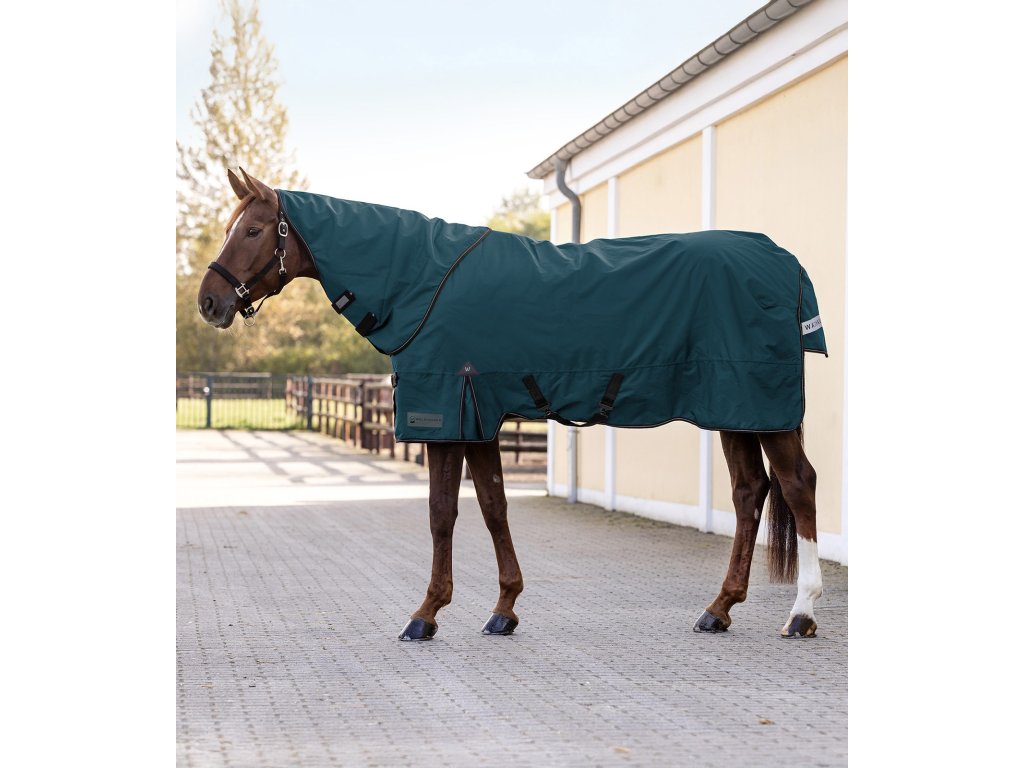 Wysokiej jakości kaptur na szyję bez ocieplenia jest wykonany z wodoodpornego i oddychającego materiału o wytrzymałości 600D. Wnętrze wyściełane jest przyjemną podszewką. Nadaje się do derki padokowej z serii Nordic i Arctic Waldhausen.