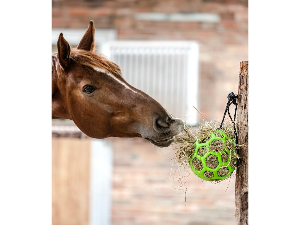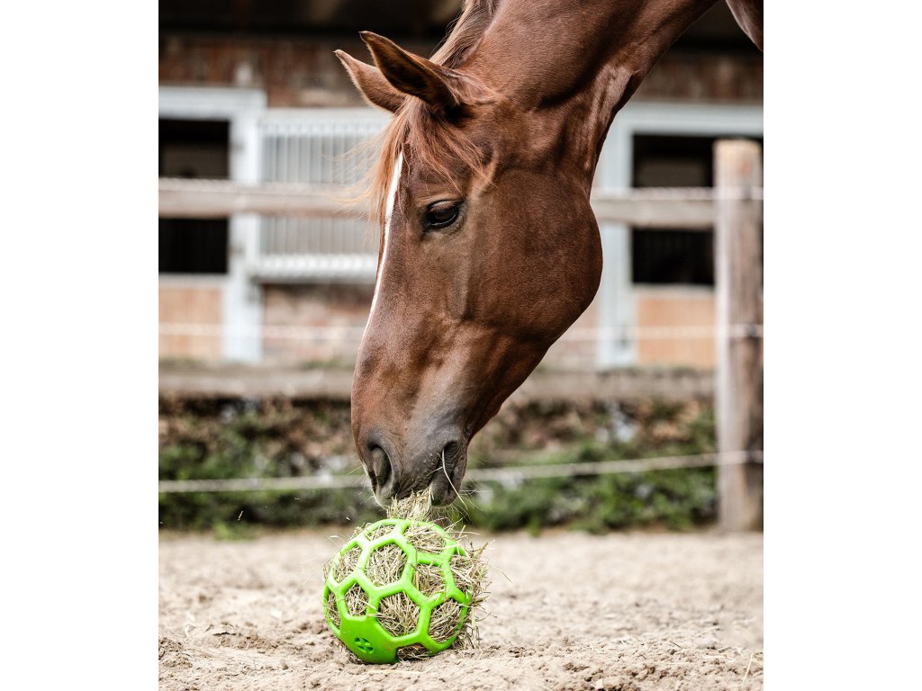 Kula na siano to idealna rozrywka na padoki lub do boksów. Działa jako odpowiednia pomoc w spowalnianiu pobierania siana. Kula może być łatwo wypełniona sianem. Dla jeszcze większej zabawy możesz dodać np. marchewki lub jabłka. Łatwa do zamocowania za pomocą 2 m paska, który jest dołączony do zestawu. Wykonana z materiału termoplastycznego, który jest bardzo wytrzymały. Ø: 22 cm. Dostępne również w kolorze różowym.