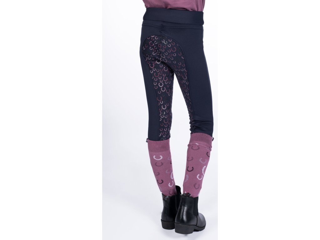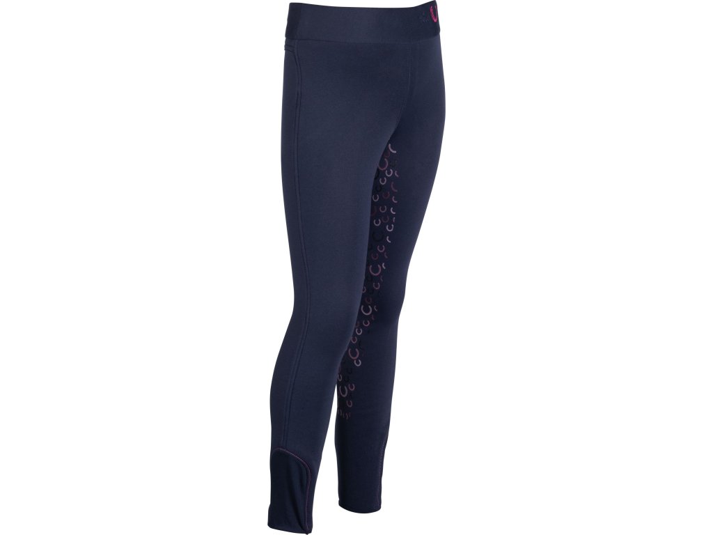 Wygodne legginsy jeździeckie wykonane z oddychającego i elastycznego materiału, odpowiednie na chłodniejsze dni dzięki dobremu zatrzymywaniu ciepła. Wyposażone są w ładny, kolorowy silikonowy lej w kształcie podkowy na całej długości siedziska. Posiadają również elastyczne zakończenia nogawek, co ułatwia ich zakładanie i zdejmowanie. Mają wyższy stan z szeroką, wygodną gumą (dodatkowo talia jest regulowana do rozmiaru 146). Ozdobione przeszyciami w pasie. Dostępne w wielu kolorach.