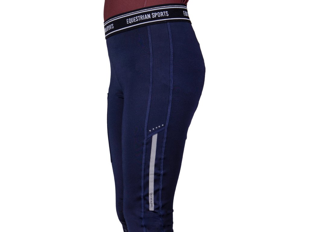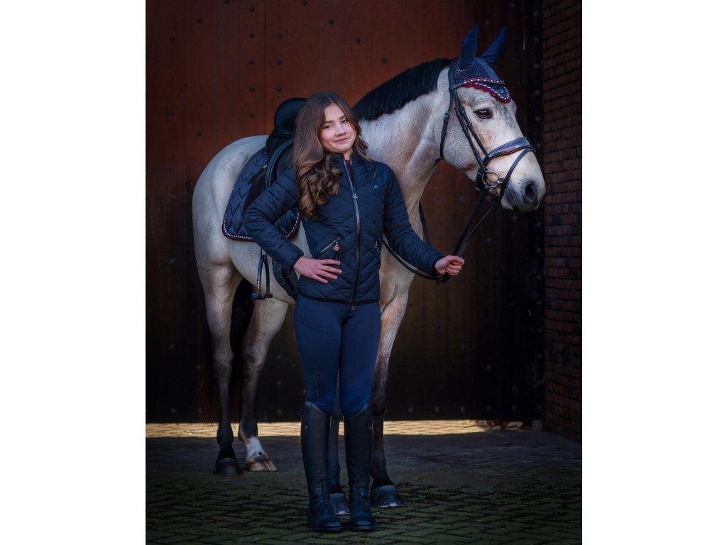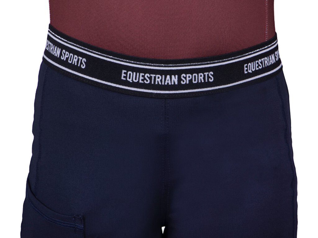 Wysokiej jakości dziecięce legginsy do jazdy konnej z silikonowym antypoślizgowym lejem na kolanach. Posiadają odblaskowy pasek na prawej nodze, wyższy stan z elastyczną talią, praktyczną kieszeń na telefon i lycrę na nogawkach. Ozdobione są błyszczącymi dżetami i napisem 'Equestrian Sport' na pasie. Legginsy są również dostępne w rozmiarach dla dorosłych i idealnie pasują do innych produktów z kolekcji Qiara. Część kolekcji jesień/zima 2023/2024.