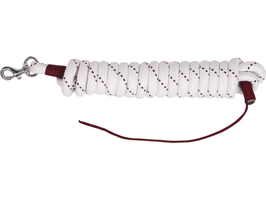 Mocny i bardzo wygodny uwiąz idealny do pracy z ziemi lub horsemanship. Z karabińczykiem, wykończony mniejszym sznurkiem. Długość 4,2 m, średnica 14 mm.