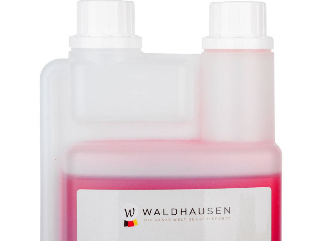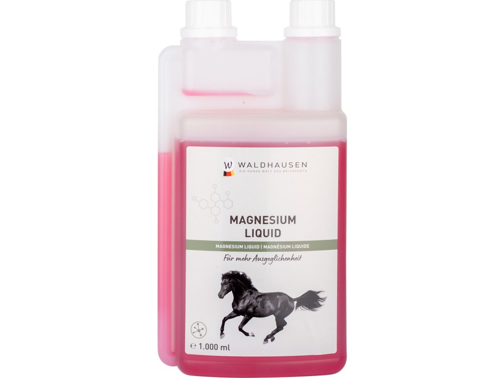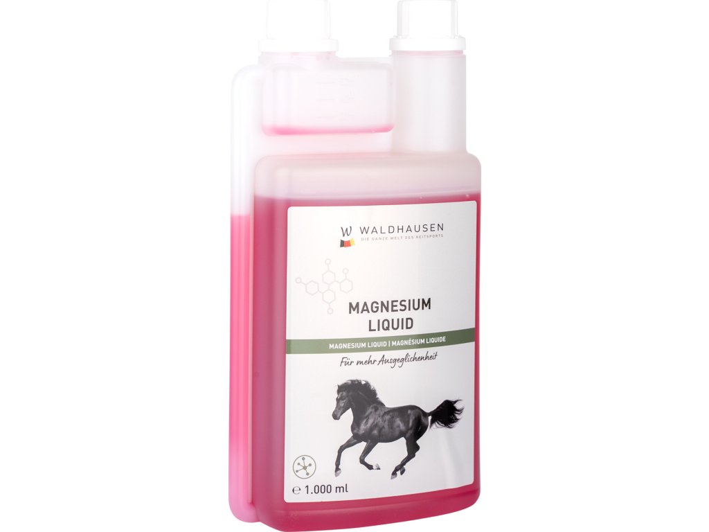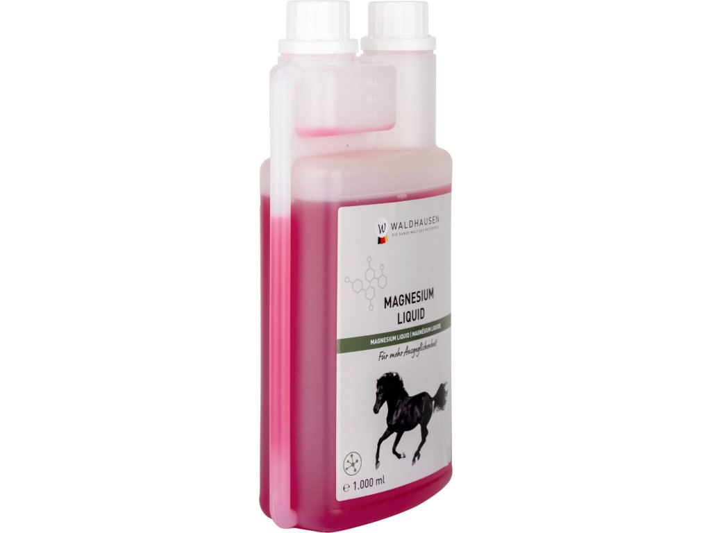 Płynny magnez – dla mocnych nerwów. Suplement diety dla koni – płynny magnez Waldhausen może tłumić reakcje na stres, zwiększać wydajność i pomagać koniowi w odzyskaniu i wzmocnieniu wewnętrznego spokoju. Połączenie z witaminą B12 wspomaga metabolizm mięśni. Dawkowanie: (wstrząsnąć przed użyciem!) Duże konie (masa ciała 600 kg) 25–50 ml dziennie, małe konie 10–30 ml dziennie. Zalecany okres karmienia: od 2 do 4 tygodni. Zalecamy skonsultowanie się ze specjalistą przed wprowadzeniem paszy uzupełniającej.