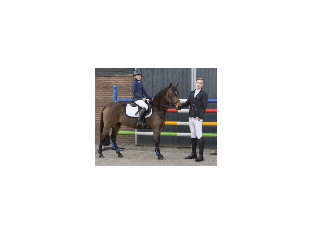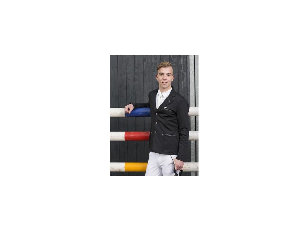 Klasyczna, zapinana na guziki marynarka konkursowa z szarym wykończeniem kieszeni, wykonana z lekko elastycznego materiału softshell, ozdobny haft "Quality Horse Products" na plecach, możliwość prania w pralce.