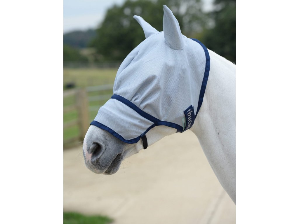 Bardzo popularna maska na muchy Buzz-Off Extended Nose z ochroną uszu i wydłużoną ochroną nosa od producenta Bucas. Cała gama masek Buzz-Off jest wykonana ze specjalnej, lekkiej siateczki, która zapewnia skuteczną ochronę przed owadami i 75% ochronę przed promieniowaniem UV. Materiał siatkowy jest bardzo trwały, miękki i skutecznie odbija światło słoneczne.Cienki materiał wzdłuż dolnej krawędzi maski pomaga utrzymać maskę z dala od oczu. Łatwe zapinanie za pomocą elastycznej taśmy z rzepem. Maska może być używana samodzielnie lub idealnie pasuje do derki Buzz-Off marki Bucas. Razem zapewniają absolutnie doskonałą ochronę.