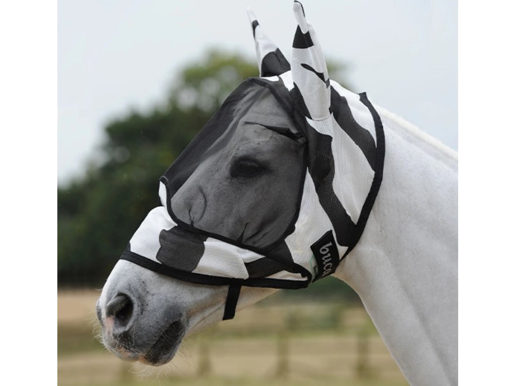 Bardzo popularna maska przeciw owadom Buzz-Off Deluxe Zebra z ochroną uszu firmy Bucas. Badania wykazały, że paski zebry odstraszają owady i dezorientują je. Cała gama masek Buzz-Off jest wykonana ze specjalnej, lekkiej siateczki, która zapewnia skuteczną ochronę przed owadami i 75% ochronę przed promieniowaniem UV. Materiał siatkowy jest bardzo trwały, miękki i skutecznie odbija światło słoneczne.Cienki materiał wzdłuż dolnej krawędzi maski pomaga utrzymać maskę z dala od oczu. Łatwe zapinanie za pomocą elastycznego paska i rzepu wraz z magnetycznym zamkiem Snap-lock. Maska może być używana samodzielnie lub idealnie pasuje do derki Buzz-Off marki Bucas. Razem zapewniają absolutnie doskonałą ochronę.
