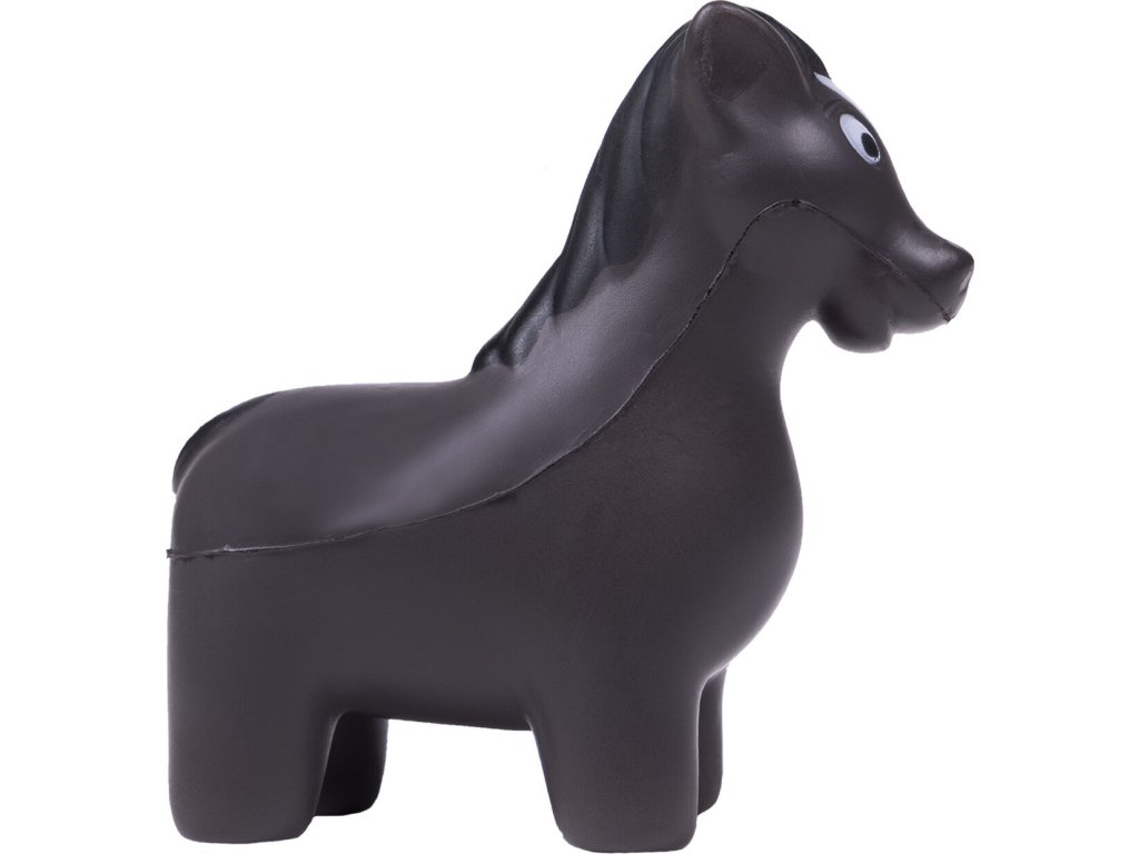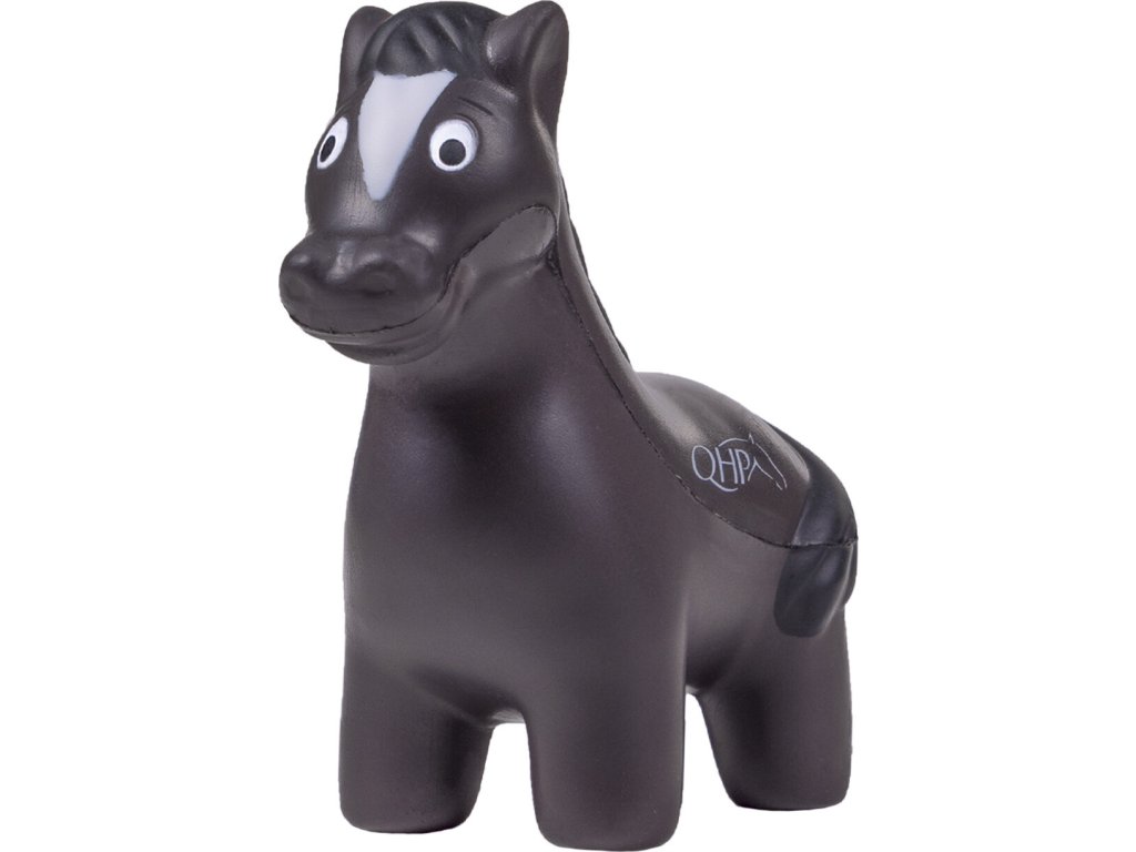 Miękka piłka antystresowa w kształcie konia, odpowiednia do ściskania. Piłka pomaga zredukować stres, na przykład przed zawodami. Oznaczona napisem QHP.