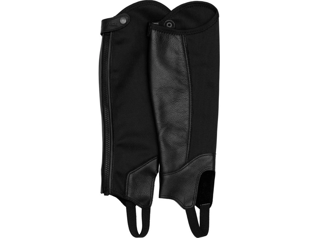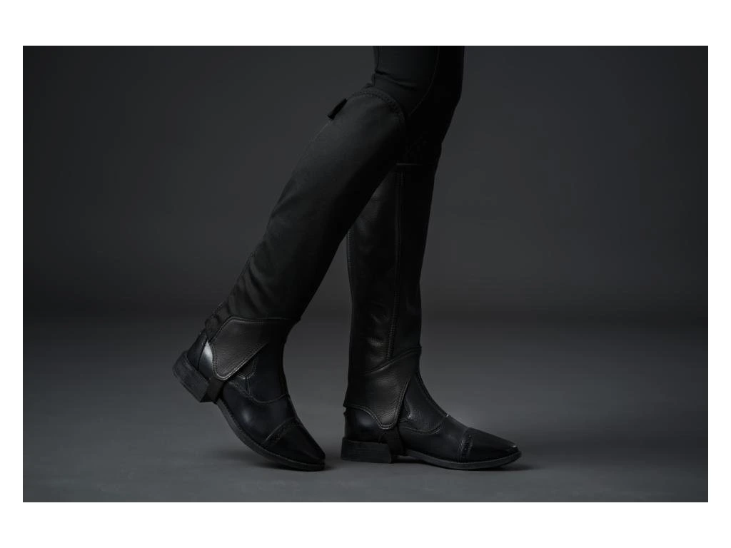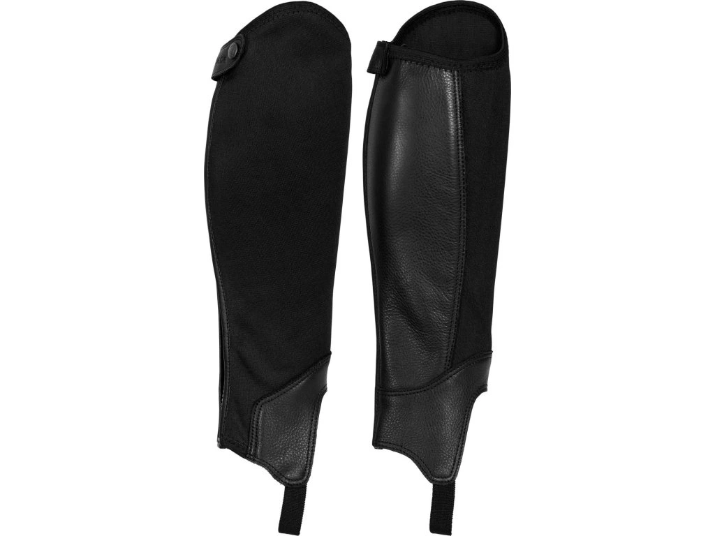 Wygodne mini-czapsy jeździeckie, wykonane z połączenia materiałów syntetycznych i skórzanych. Wewnętrzna część mini-czapsów wykonana jest z wytrzymałego materiału skórzanego, zewnętrzna część z elastycznej dwuwarstwowej tkaniny. Dzięki elastycznej wstawce, mini-czapsy idealnie przylegają do nogi, nie ograniczając ruchów jeźdźca. Wyposażone są w mocne zamki YKK z tyłu.