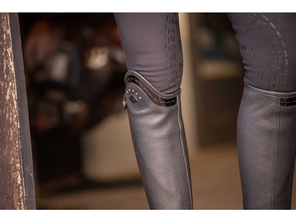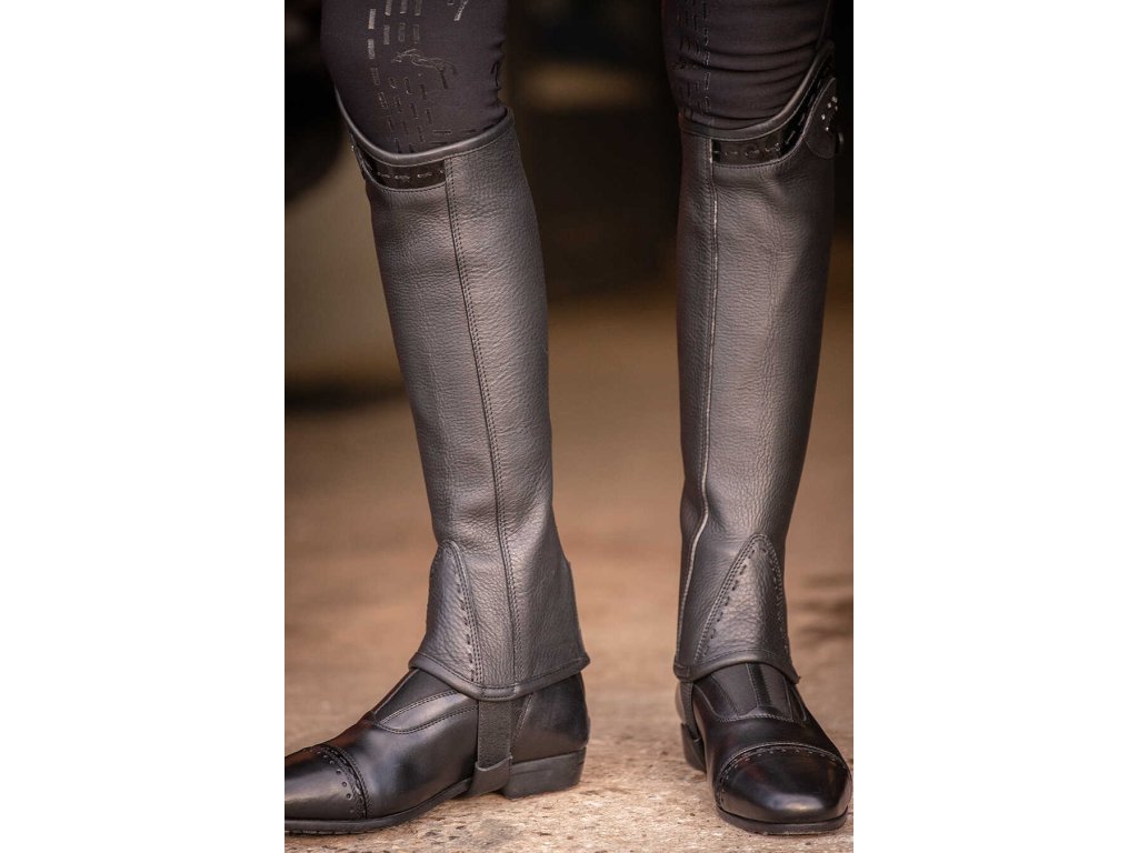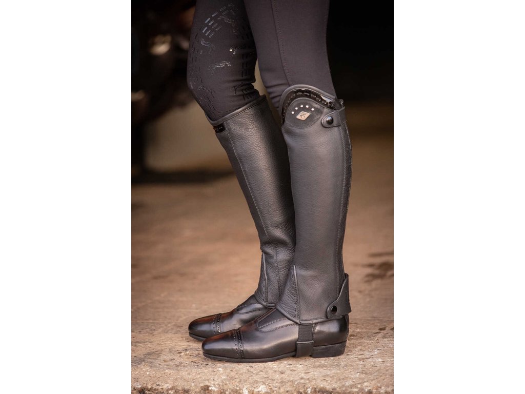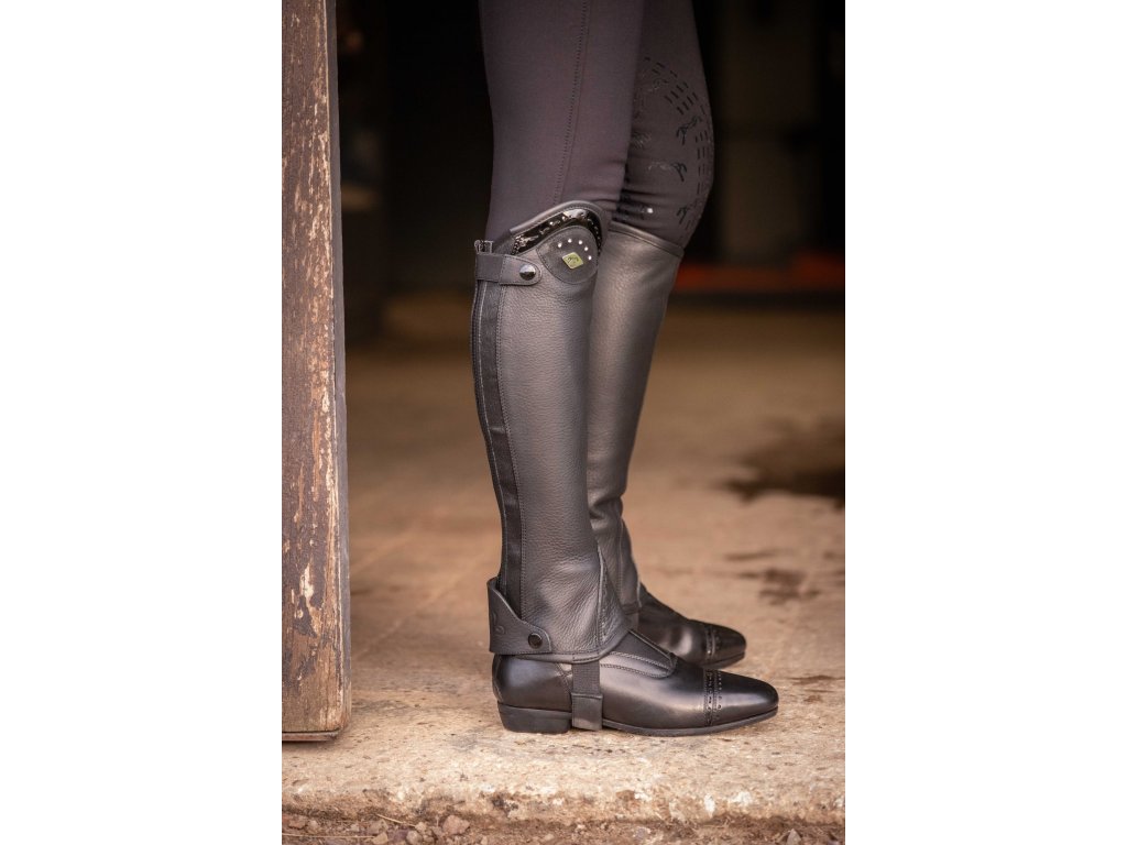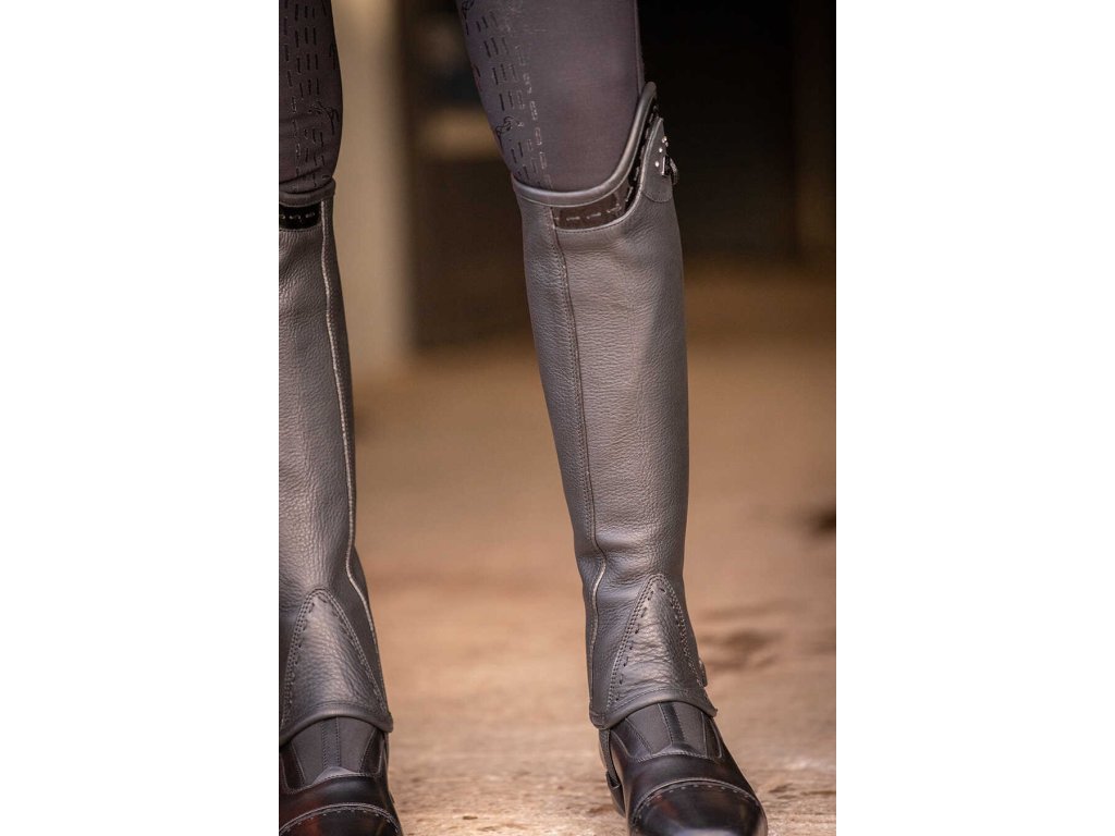 Skórzane mini-czapsy Prisca z zapięciem na zamek i elastycznym panelem z tyłu. Zapięcie idealnie modeluje łydkę i zapewnia wygodne dopasowanie. Górna część czapsów charakteryzuje się dekoracyjnym lakierowaniem, delikatnymi dżetami i srebrną odznaką w kształcie diamentu z logo Pénélope. Elastyczny pasek pod butem zapewnia stabilność podczas noszenia.