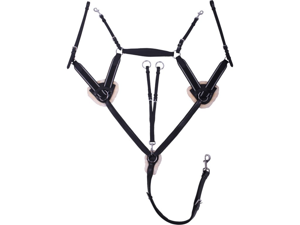 Pięciopunktowy napierśnik z odpinanym wytokiem, który zapobiega przesuwaniu się siodła do tyłu podczas skoków. Posiada podszycie na łopatkach i klatce piersiowej wykonane ze sztucznego futra. Podszycie jest wyjmowane i można je prać w pralce. Obwód, paski piersiowe i kłąb są wyściełane miękką skórą. Elastyczne paski zapewniają większą swobodę ruchów i amortyzację. Łatwo mocuje się do obwodu za pomocą klipsa. Pasuje do innych produktów z kolekcji Ontario.