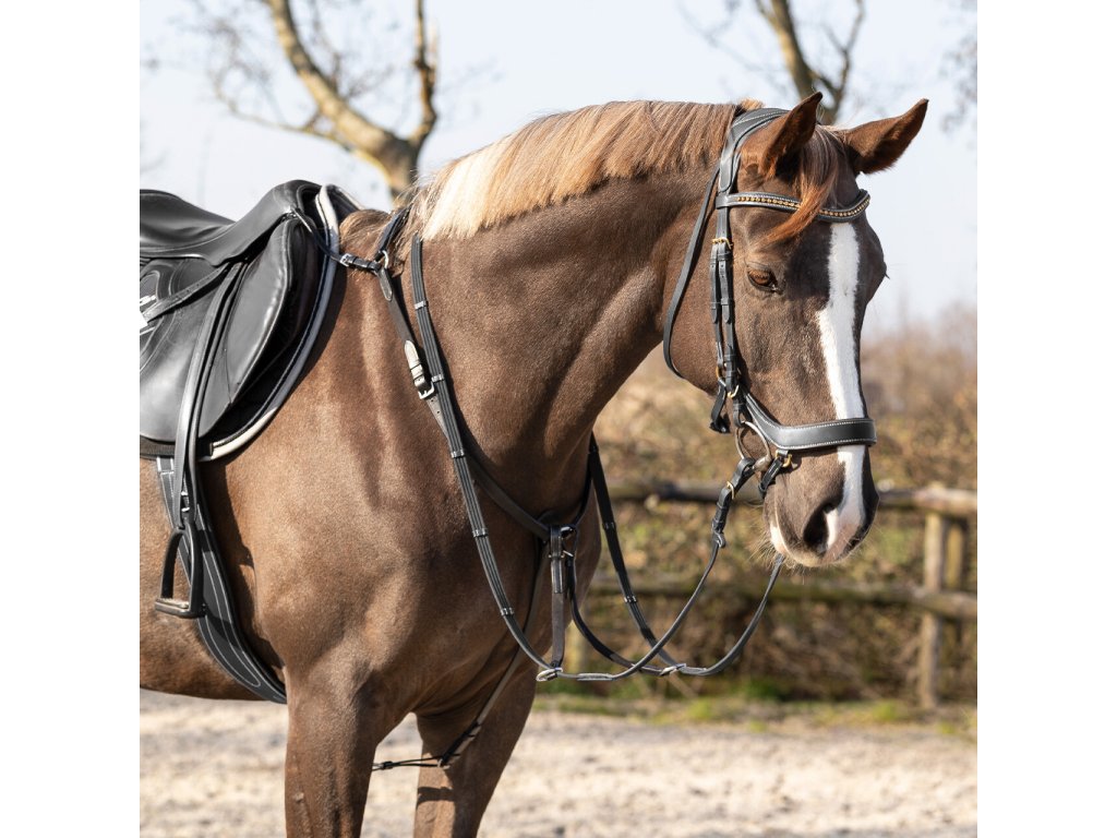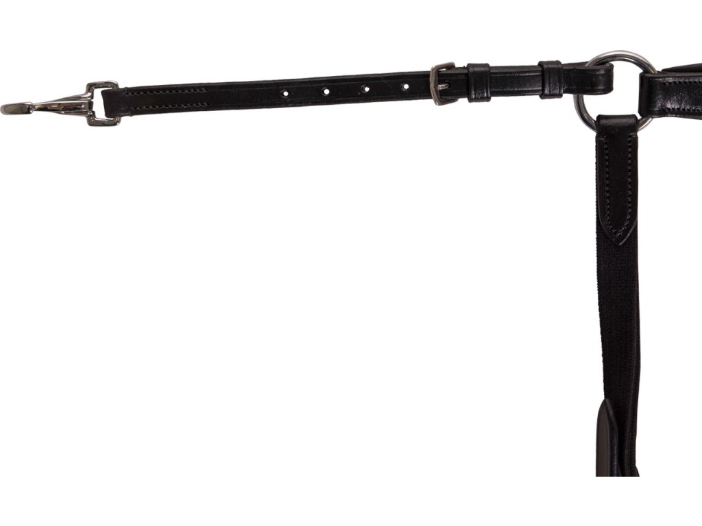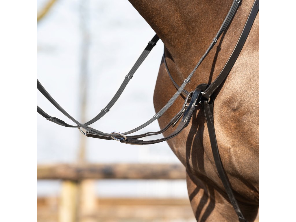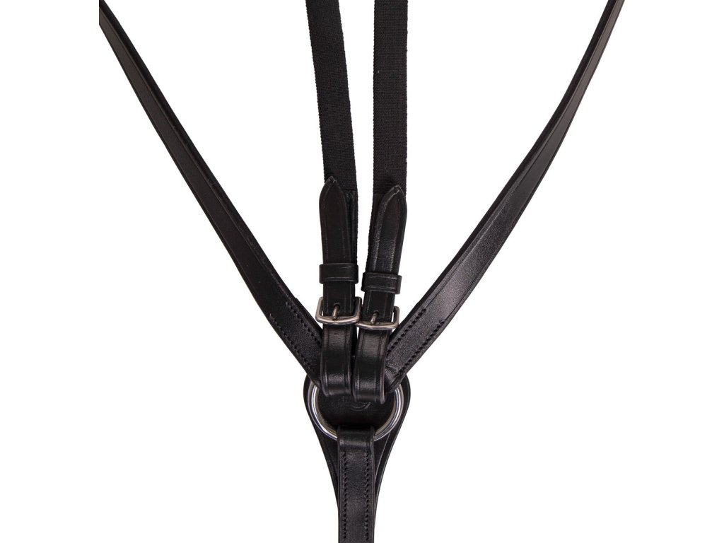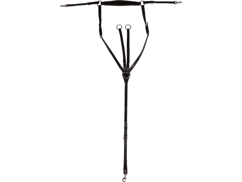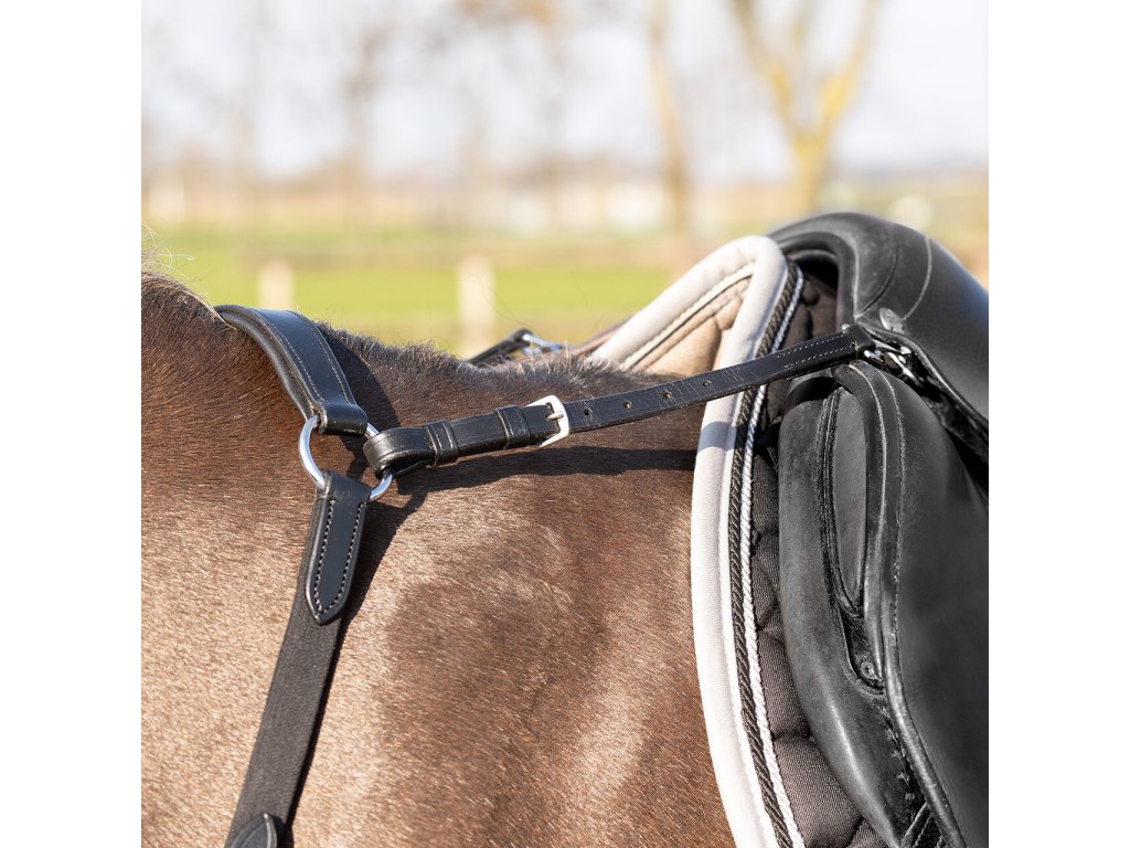 Wysokiej jakości skórzany napierśnik trzypunktowy. Wyposażony w odpinany łącznik do wytoku. Utrzymuje siodło we właściwej pozycji i zapobiega jego przesuwaniu się w okolice lędźwiowe. Gumowe wyściełanie zapewnia maksymalny komfort. Wyposażony w okucia ze stali nierdzewnej. Naprśnik jest regulowany w kilku miejscach, dzięki czemu można go łatwo dopasować do pożądanego rozmiaru.