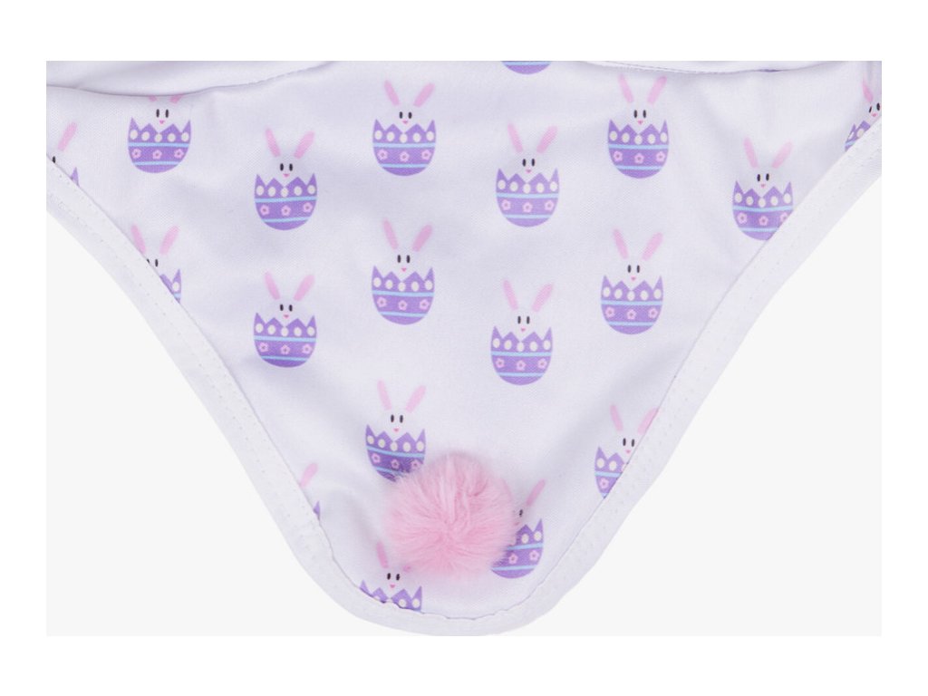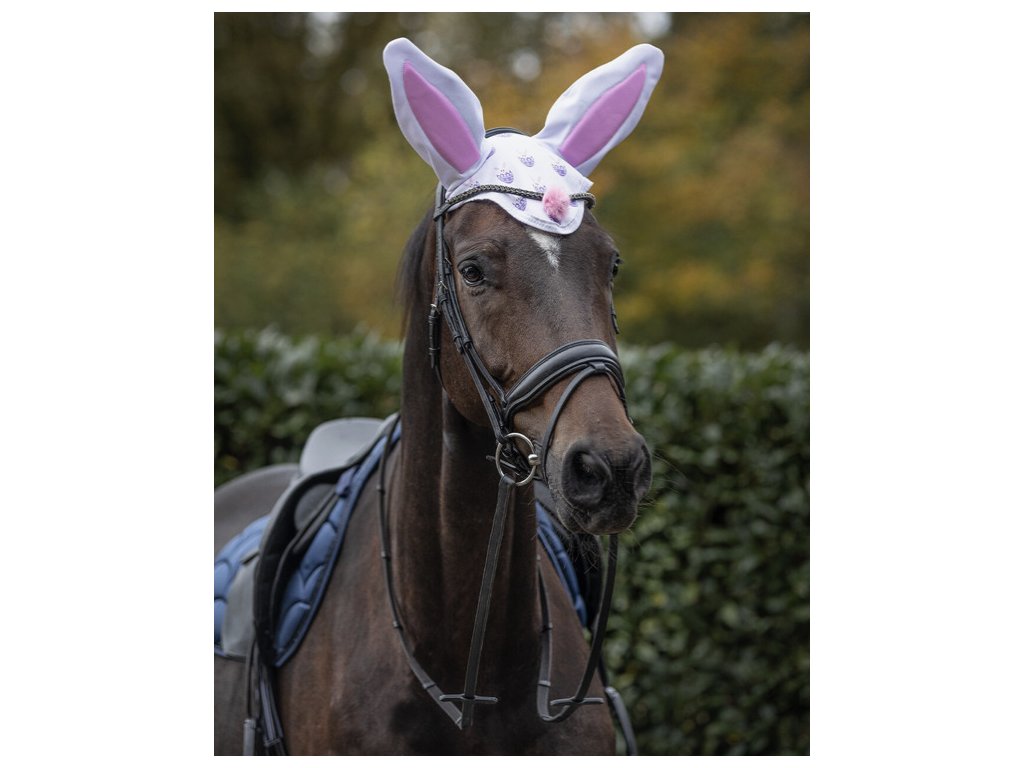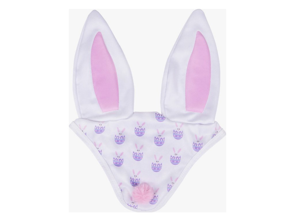 Urocze nauszniki z uszkami króliczka. Ozdobione nadrukiem pisanek z króliczkami. Idealnie pasują do innych akcesoriów wielkanocnych.