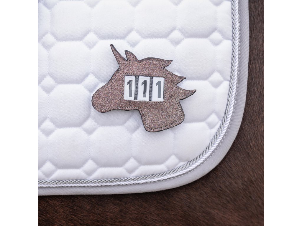 Trzycyfrowy numer startowy w kształcie jednorożca z delikatnym brokatem. Dostarczany razem z wymiennymi numerami. Można go łatwo przymocować do czapraka lub ogłowia za pomocą rzepu i agrafki.