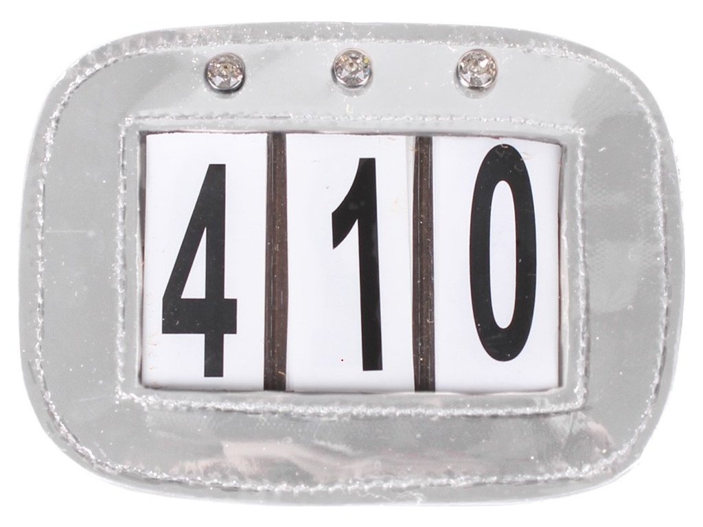 Tarcza konkursowa wykonana ze skóry lakierowanej i ozdobnych dżetów.Dostarczana z wymiennymi numerami. Można łatwo przymocować za pomocą rzepu i agrafki do ogłowia i siodła. Rozmiar: 11 x 8,5 cm. Dostarczane w zestawie po 2 sztuki.