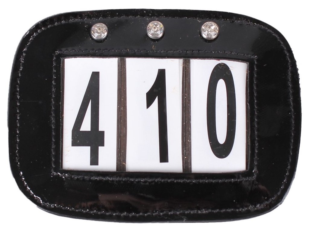 Tarcza konkursowa wykonana ze skóry lakierowanej i ozdobnych dżetów.Dostarczana z wymiennymi numerami. Można łatwo przymocować za pomocą rzepu i agrafki do ogłowia i siodła. Rozmiar: 11 x 8,5 cm. Dostarczane w zestawie po 2 sztuki.