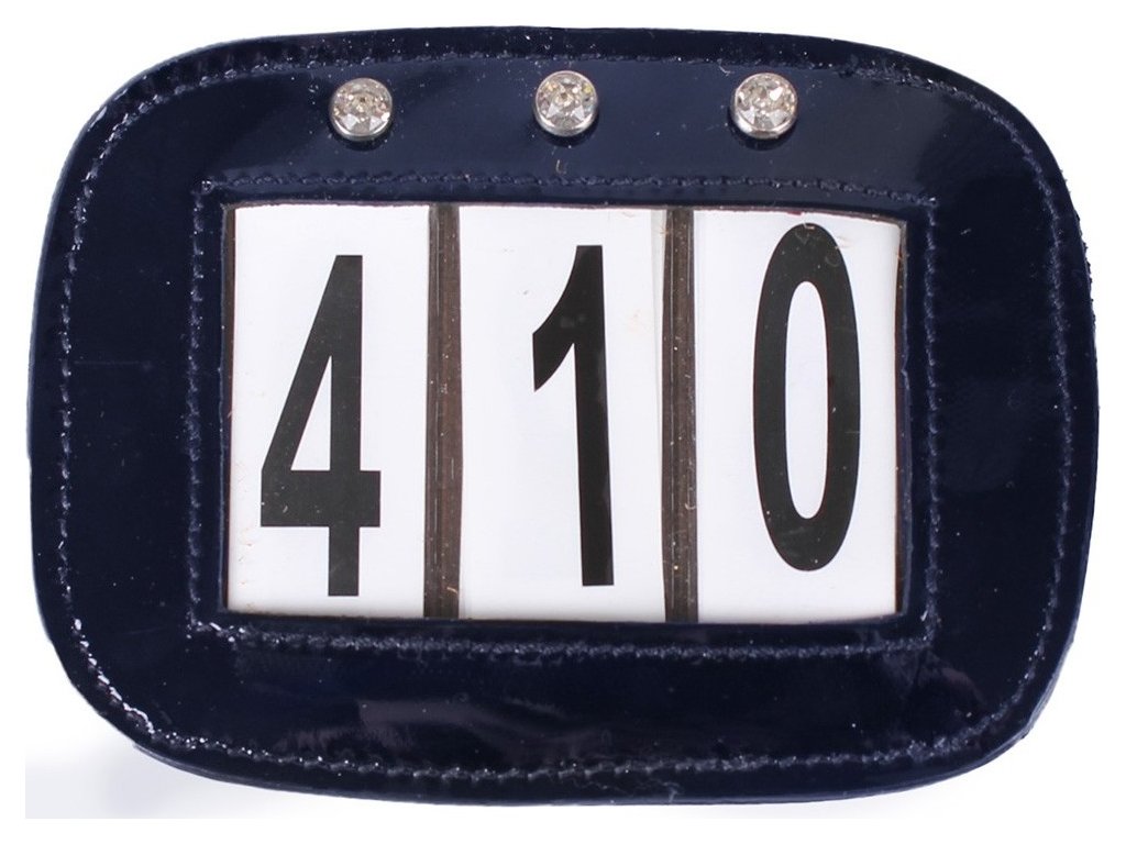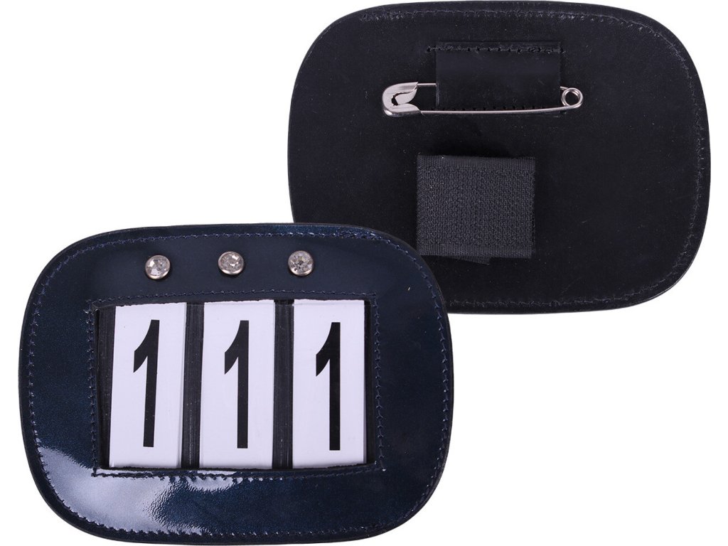 Tarcza konkursowa wykonana ze skóry lakierowanej i ozdobnych dżetów.Dostarczana z wymiennymi numerami. Można łatwo przymocować za pomocą rzepu i agrafki do ogłowia i siodła. Rozmiar: 11 x 8,5 cm. Dostarczane w zestawie po 2 sztuki.