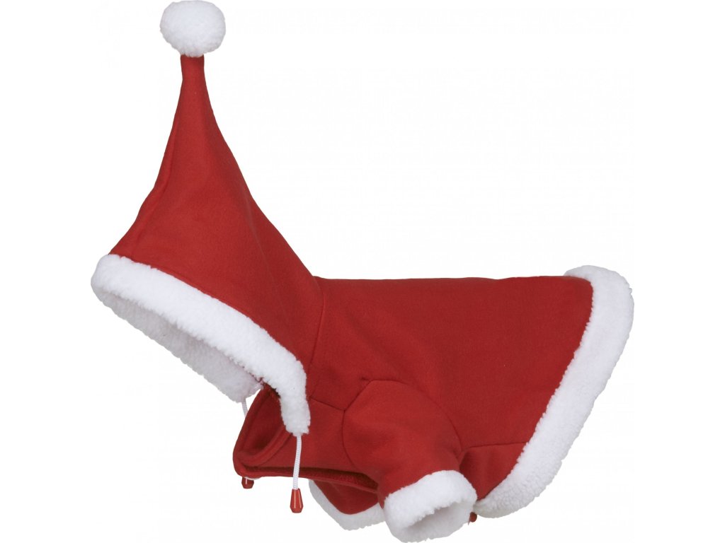 Urocze świąteczne ubranko dla psów w odważnym czerwonym kolorze, wykończone białym sztucznym futerkiem. Zapinane na rzep i ozdobny guzik. Podany rozmiar to długość górnej (tylnej) części ubranka.