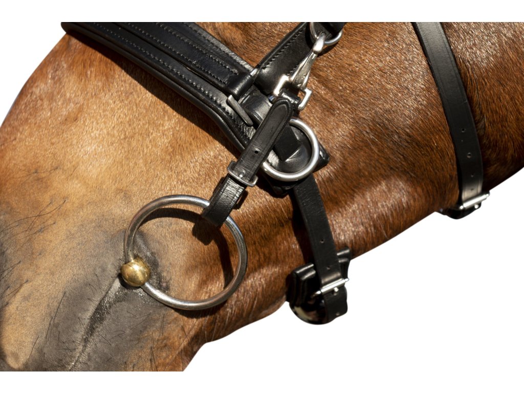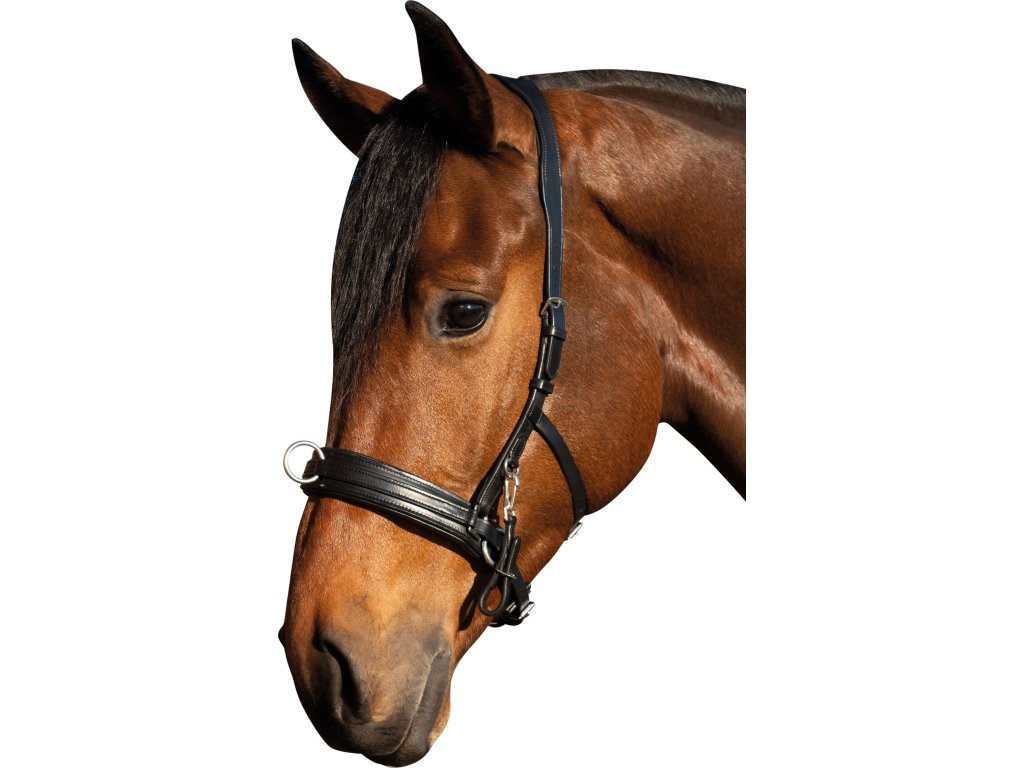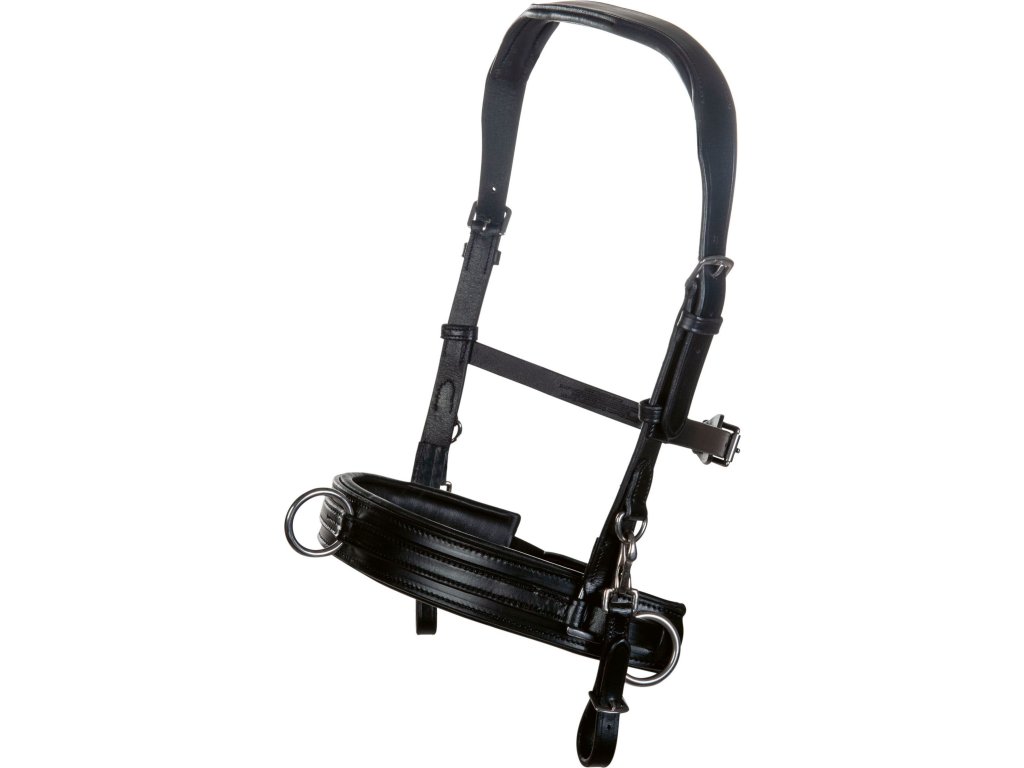 Kawecan do lonżowania wykonany z wytrzymałej i bardzo delikatnej skóry z miękkim podszyciem. Może być używany z lub bez wędzidła. Kawecan jest wyposażony w jeden pierścień na środku i dwa bardzo duże pierścienie po bokach, które można wymieniać. Paski policzkowe mocowane za pomocą karabińczyków. Kawecan ma zmienne ustawienia w kilku miejscach, w zależności od potrzeb. Bez metalowej wkładki. Dostępne w kolorze czarnym.