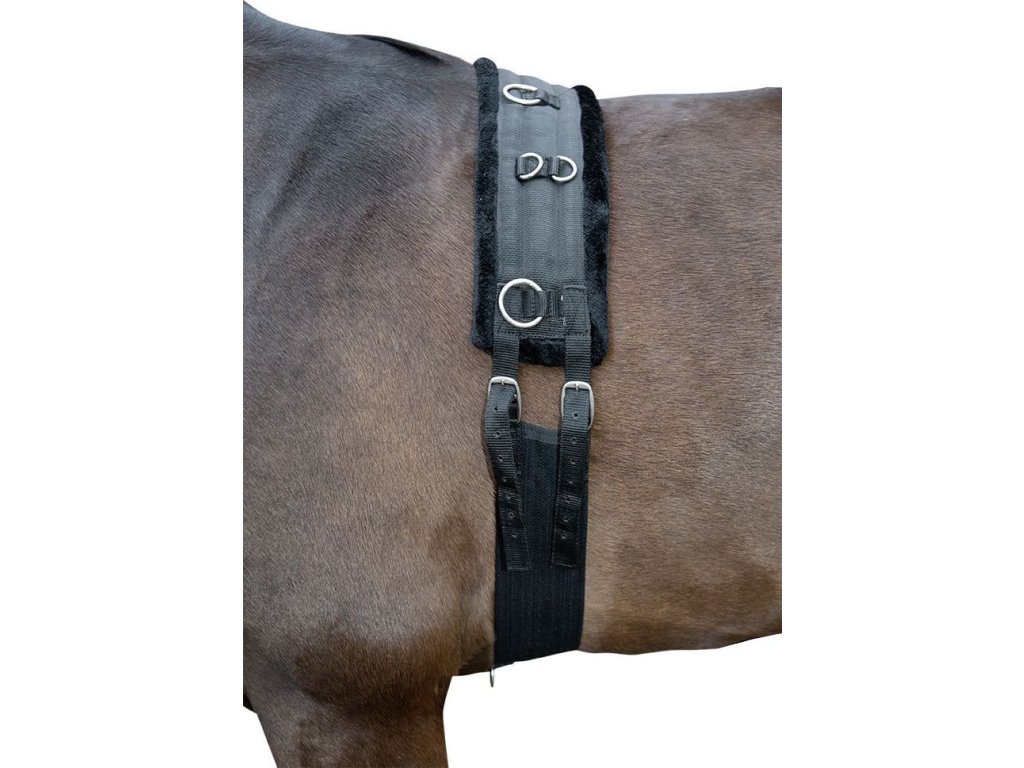 Pas do lonżowania z miękką, syntetyczną skórą jagnięcą w części grzbietowej z pasem parcianym. Pas do lonżowania jest wyposażony w kilka kółek do mocowania pomocy treningowych i łatwo regulowany po obu stronach. Wysokiej jakości okucia w kolorze srebrnym. Dostępne w różnych rozmiarach.