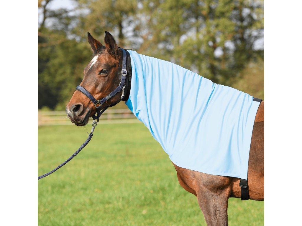 Oddychająca osłona na szyję dla koni z egzemą, zapobiega dostępowi owadów i zmniejsza ryzyko egzemy. Osłona na szyję może być również używana jako ochrona zaplecionej grzywy przed zawodami i pokazami. Wykonana jest z szybkoschnącej, oddychającej, lekko elastycznej mieszanki poliestru. Osłona na szyję zapinana jest na rzep i może być przymocowana do kantara.Elastyczny, regulowany pas brzuszny nie krępuje ruchów konia.