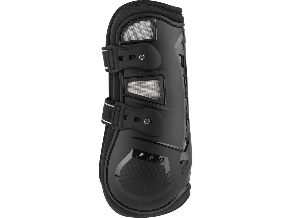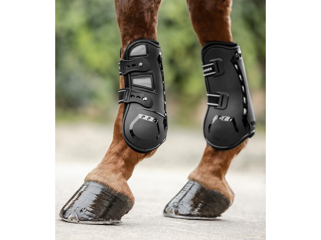 Para anatomicznie ukształtowanych ochraniaczy na ścięgna na przednie nogi, które chronią ścięgna przed uderzeniami i otarciami. Ochraniacze na pęciny są wyposażone w specjalną wyściółkę z pianki memory, która skutecznie amortyzuje wstrząsy. Małe oddychające otwory wentylacyjne zapobiegają przegrzewaniu się ścięgien i więzadeł oraz zapewniają dobrą cyrkulację powietrza. Wyposażone w elastyczne paski z klipsami szybkiego uwalniania. Idealnie pasujące ochraniacze na pęciny można dokupić osobno do ochraniaczy na ścięgna.