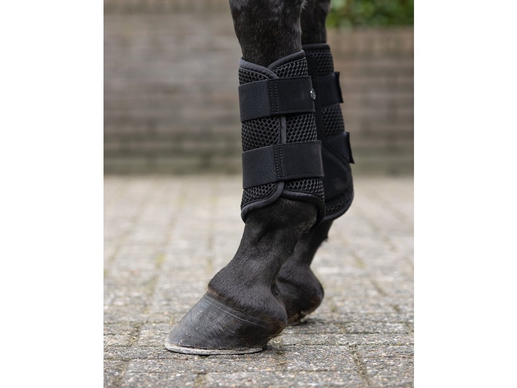 Wysokiej jakości ochraniacze sportowe, które chronią ścięgna konia przed urazami. Nadają się zarówno na przednie, jak i tylne nogi. Wykonane z siatki 3D i neoprenowej wyściółki. Materiał ten jest elastyczny, wysoce oddychający, zapewnia optymalny przepływ powietrza i skutecznie odprowadza wilgoć oraz nadmiar ciepła. Neoprenowa wyściółka zapewnia doskonałą amortyzację i rozkład nacisku. Posiadają dwa elastyczne zapięcia na rzepy. Są ozdobione małym, dyskretnym logo Q na zapięciu. Ochraniacze ujeżdżeniowe idealnie pasują do innych produktów z kolekcji Jorine QHP.