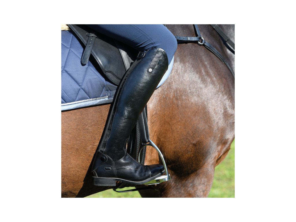 Długie buty jeździeckie Bondy BUSSE wykonane z połączenia materiałów zapewniają bardzo praktyczne zastosowanie. Zewnętrzna część buta jest wykonana z wytrzymałej skóry syntetycznej (Kunstleder). Cholewka jest wykonana z bardzo wytrzymałej skóry o specjalnych właściwościach klejących. Materiał ten zapewnia idealne dopasowanie i umożliwia doskonały kontakt między jeźdźcem a koniem. Dolna część buta jest wykonana z wytrzymałej skóry bydlęcej i zapewnia wysoki komfort podczas chodzenia oraz prawidłową stabilność. Zamek błyskawiczny YKK® na całej długości z elastyczną wstawką dla łatwego wsuwania (elastyczna wstawka z rozszerzeniem do 1 cm). Zamek błyskawiczny jest zakryty u góry i na dole i można go zabezpieczyć skórzanym paskiem z zapięciem na zatrzask. Buty są również wyposażone w amortyzującą gumową podeszwę, twardy obcas dla maksymalnego komfortu oraz szybkoschnącą nylonową wyściółkę z wyjmowaną, profilowaną wkładką wewnętrzną. Wysokość wyciętej zewnętrznej części buta wynosi 5 cm. Dostępne również w innym kroju łydki.