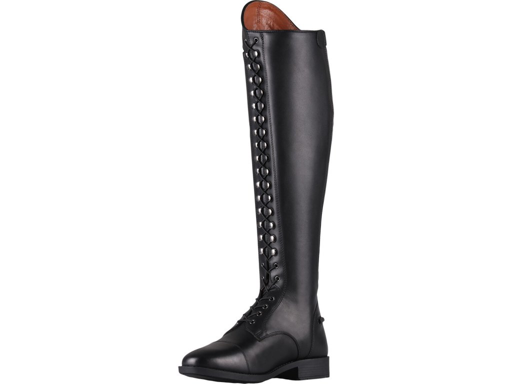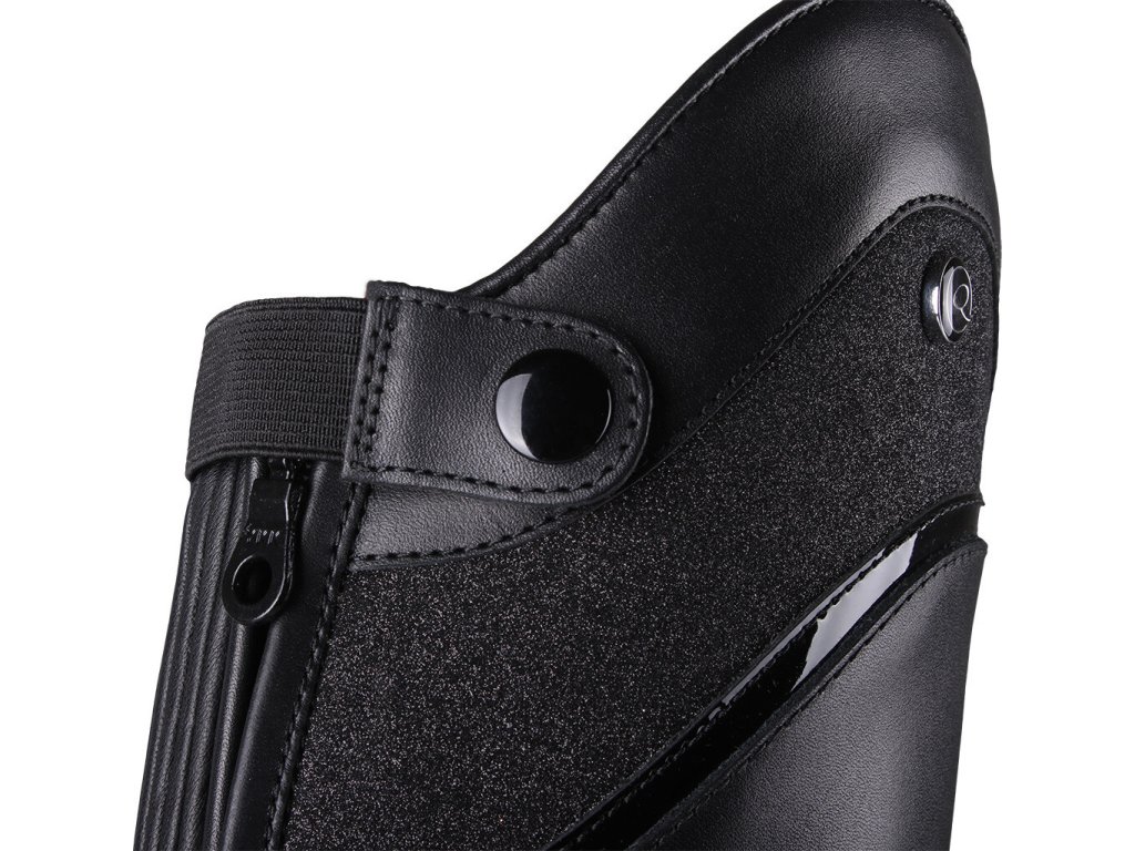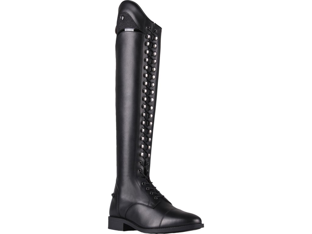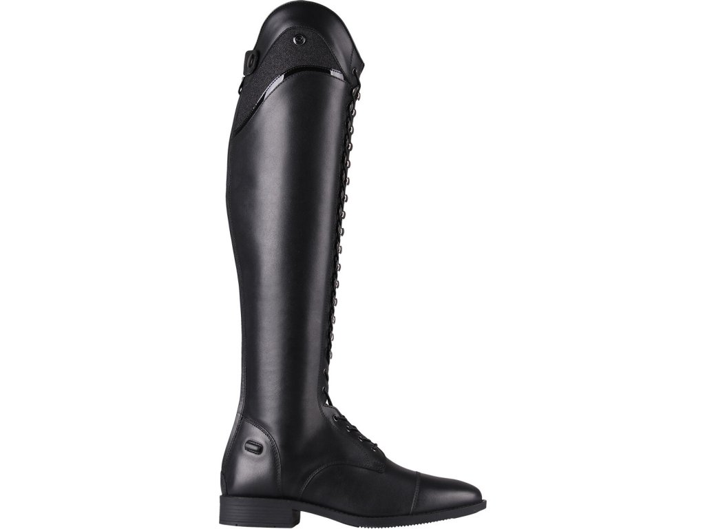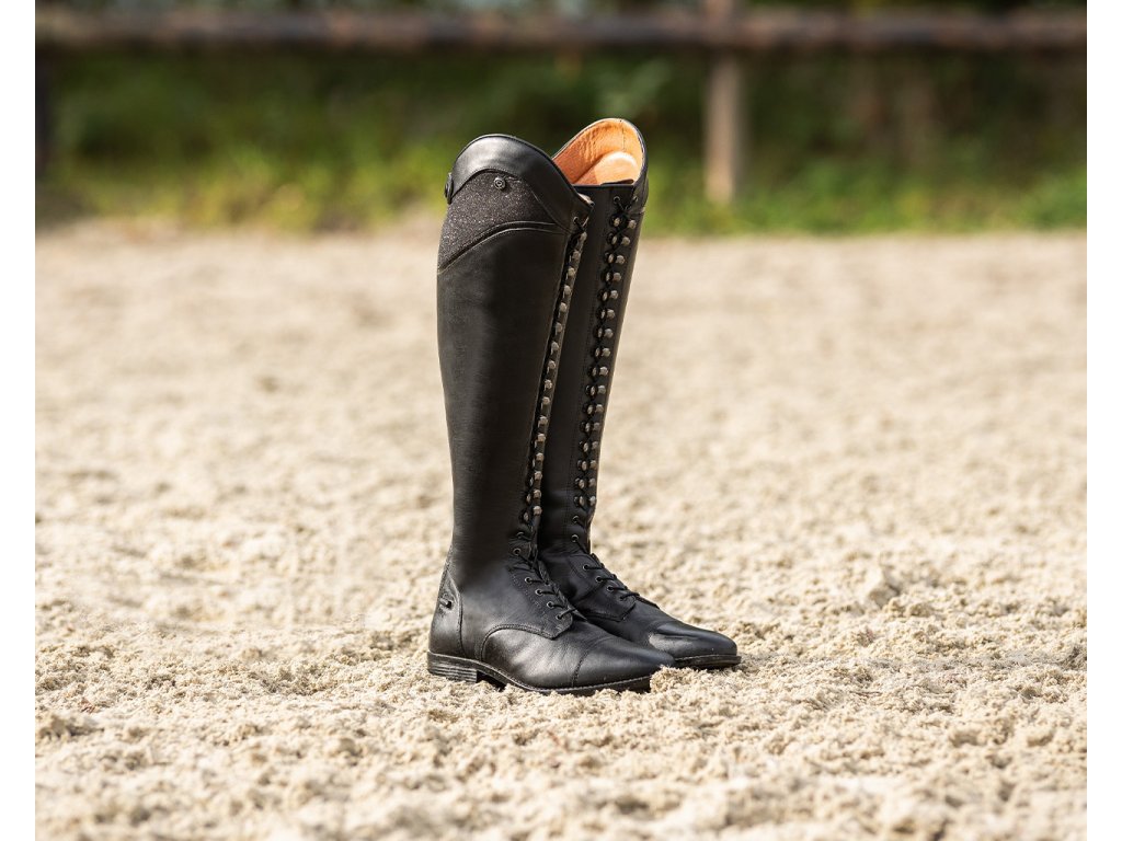 Bardzo wysokiej jakości buty jeździeckie wykonane z bydlęcej skóry lakierowanej. Wyposażone są w zamek błyskawiczny z tyłu, co ułatwia ich zakładanie. Zamek błyskawiczny jest również zabezpieczony guzikiem i posiada elastyczną wstawkę po obu stronach dla maksymalnego komfortu. Ozdobione są długimi sznurowadłami, które wraz z błyszczącymi detalami nadają butom elegancki wygląd. Buty są również dostępne w rozmiarach dla standardowych łydek oraz w rozmiarach dla dzieci.