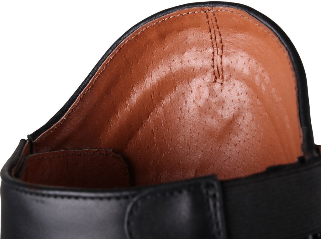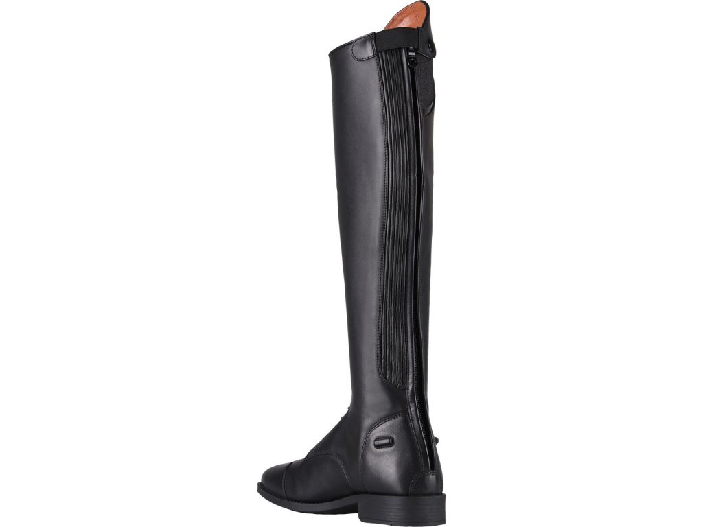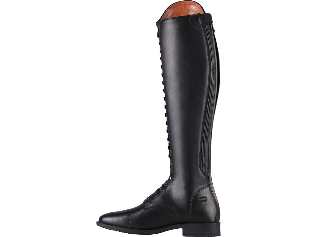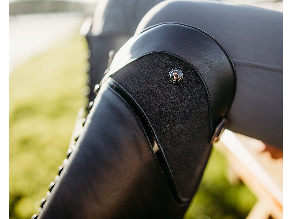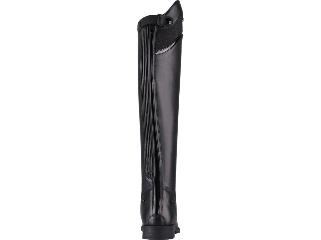 Bardzo wysokiej jakości buty jeździeckie wykonane z bydlęcej skóry lakierowanej. Wyposażone są w zamek błyskawiczny z tyłu, co ułatwia ich zakładanie. Zamek błyskawiczny jest również zabezpieczony guzikiem i posiada elastyczną wstawkę po obu stronach dla maksymalnego komfortu. Ozdobione są długimi sznurowadłami, które wraz z błyszczącymi detalami nadają butom elegancki wygląd. Buty są również dostępne w rozmiarach dla standardowych łydek oraz w rozmiarach dla dzieci.