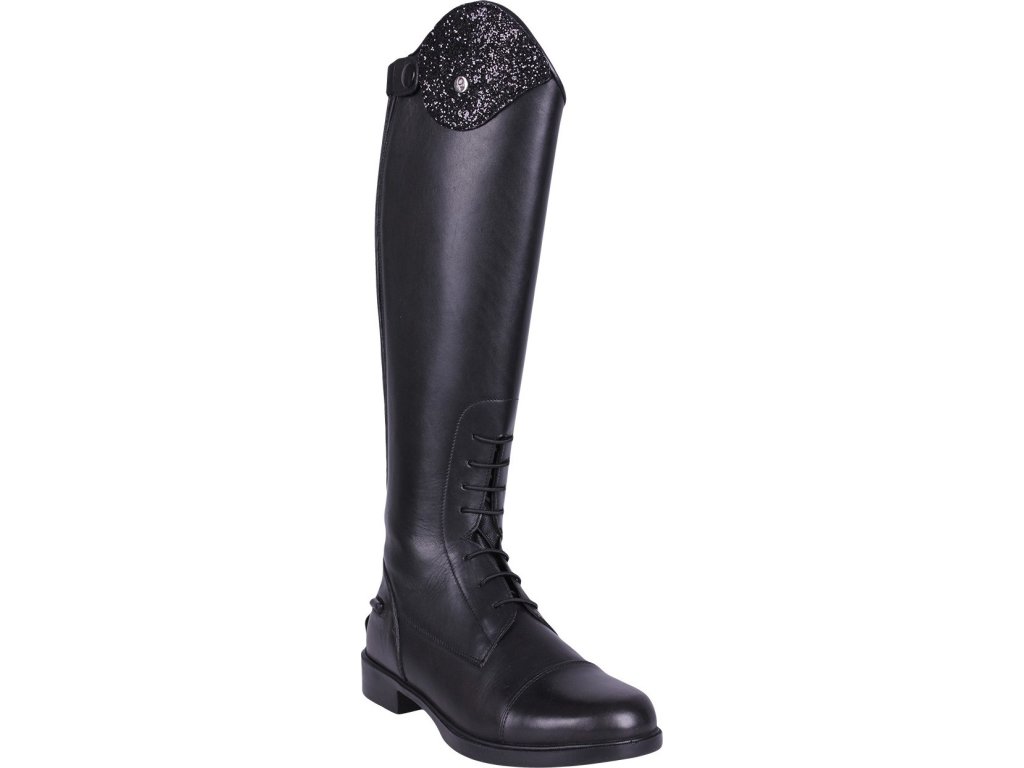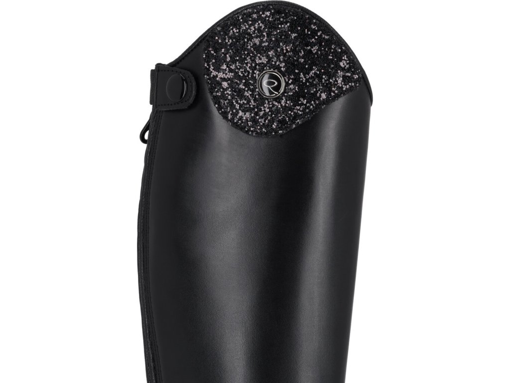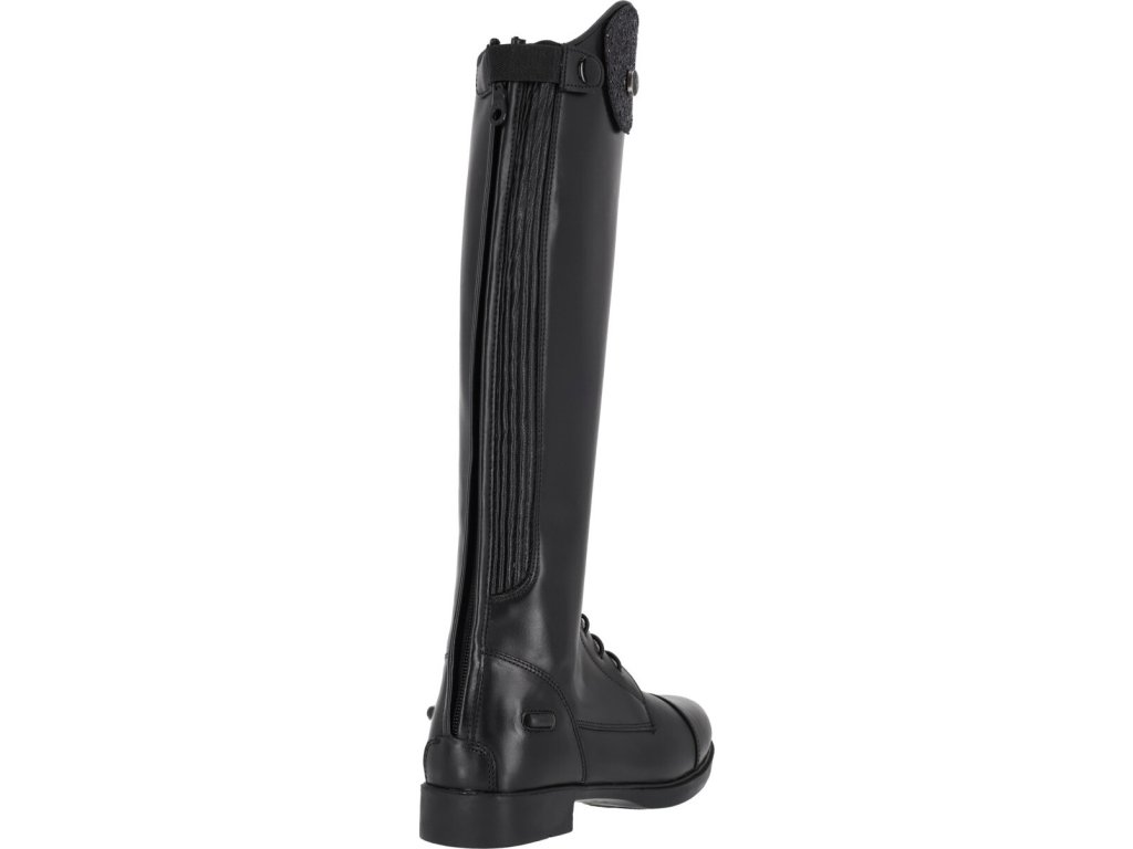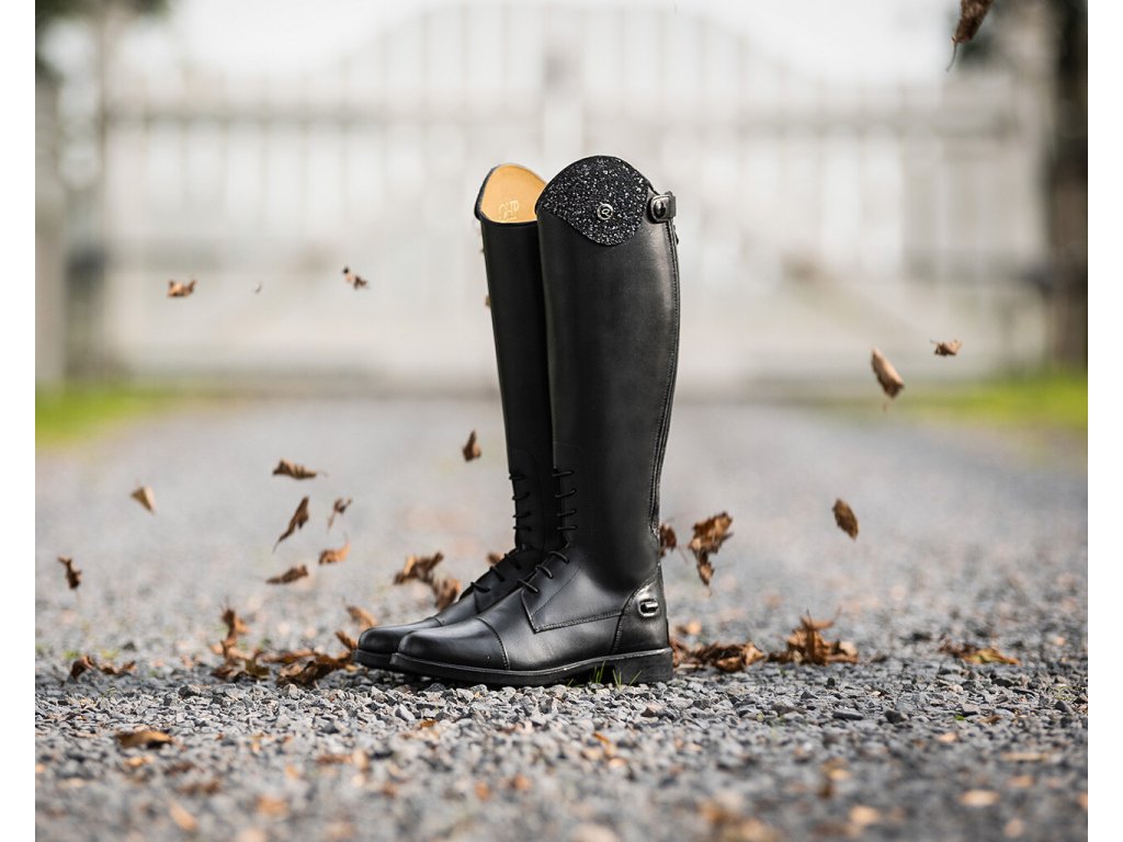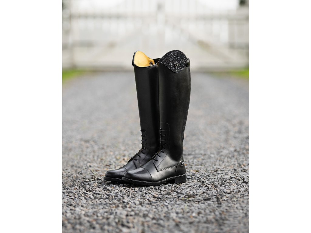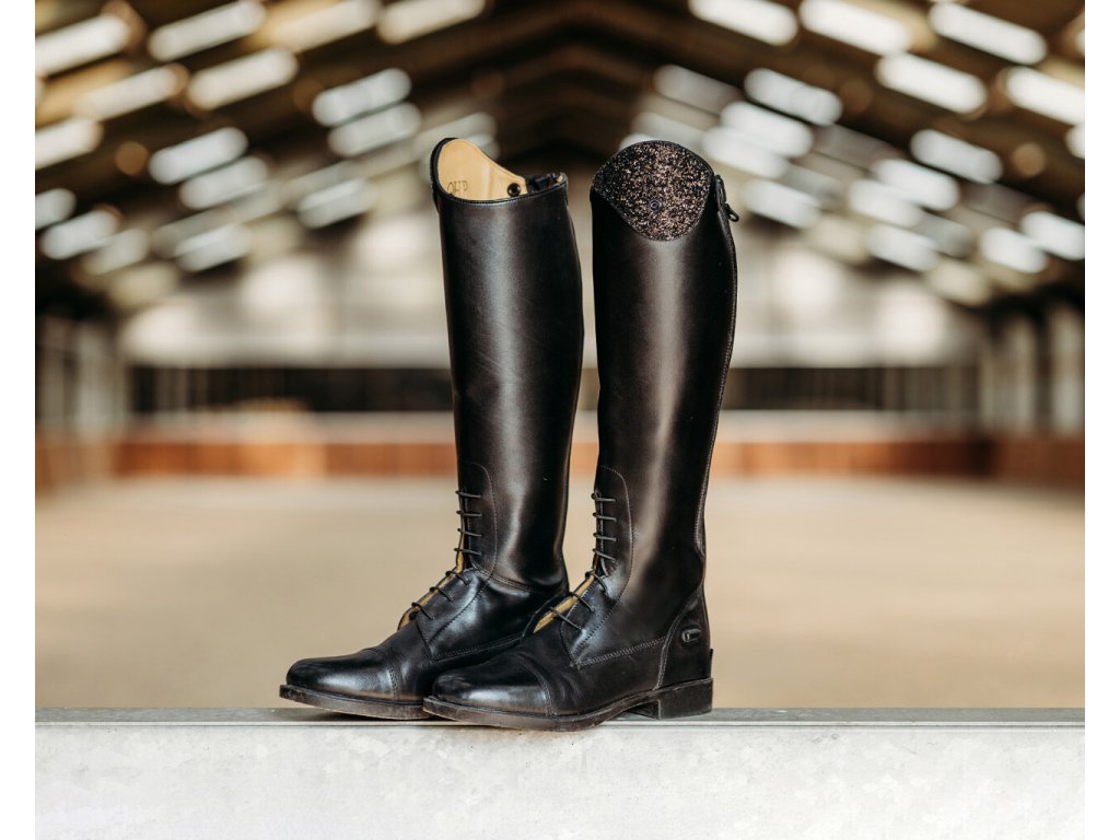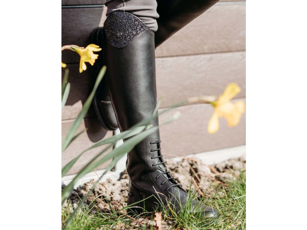 Juniorskie jeździeckie buty do jazdy konnej wykonane z wysokiej jakości skóry bydlęcej. Wygląd można dowolnie zmieniać dzięki elementowi dekoracyjnemu u góry buta.Zapinane na zamek błyskawiczny z tyłu wraz z jego ochroną i ogranicznikami ostróg. Eleganckie sznurowanie z przodu. Podstawowy wymienny element dekoracyjny jest wliczony w cenę, inne można dokupić osobno. Dostępne dla wyższej, standardowej i szerszej łydki.