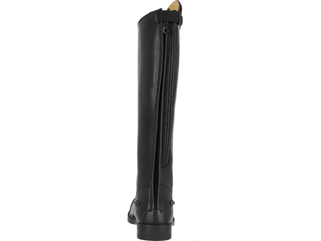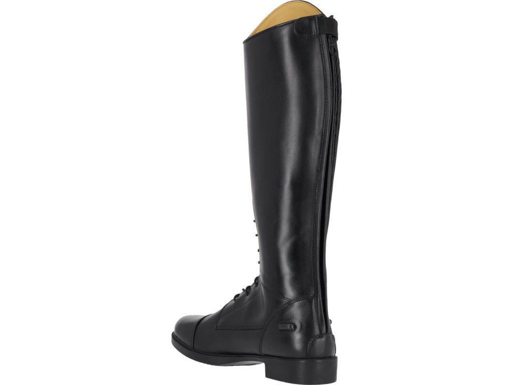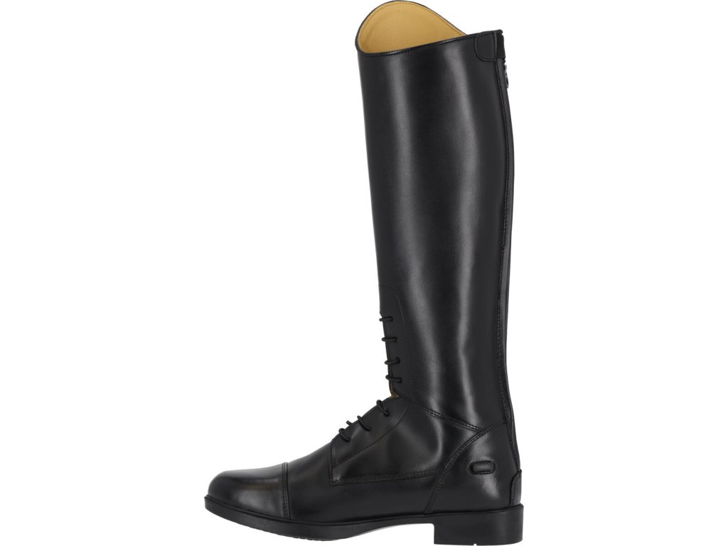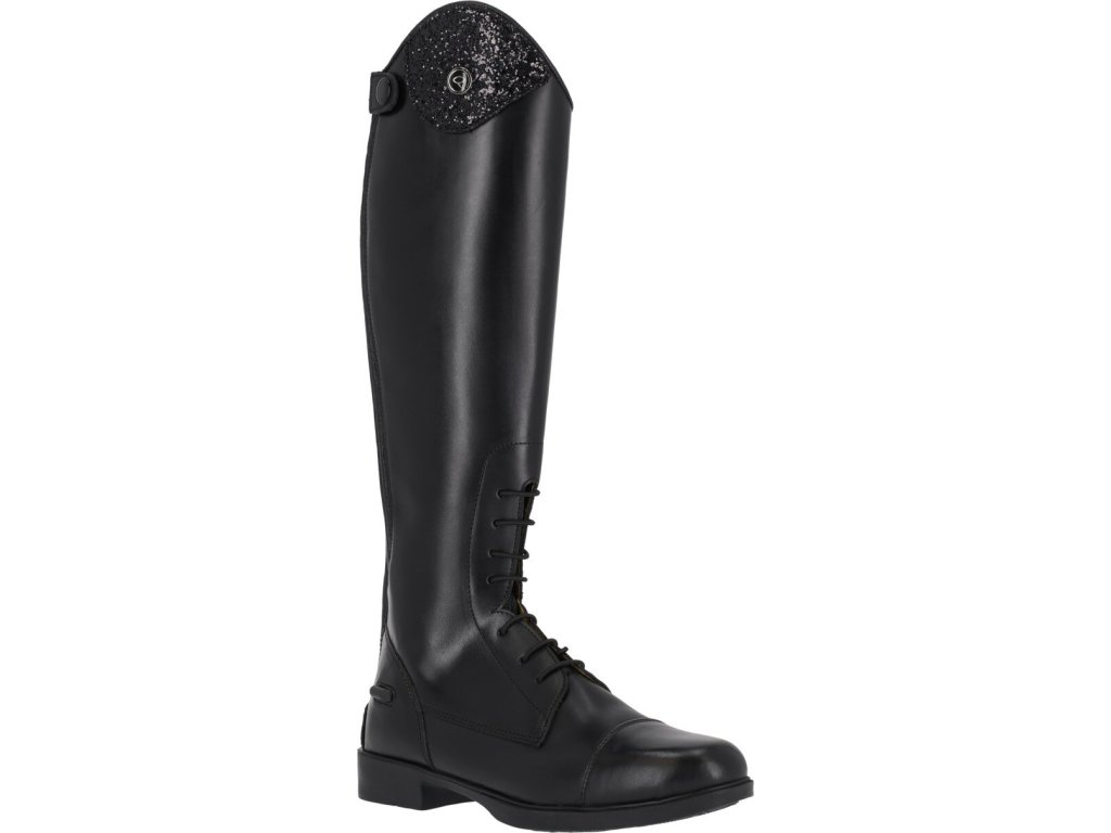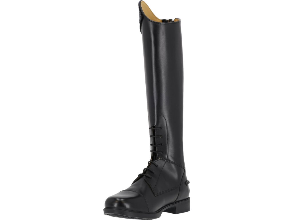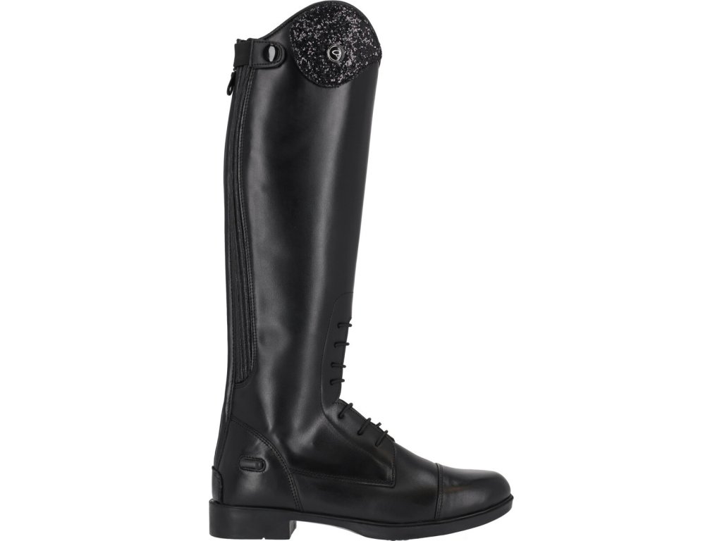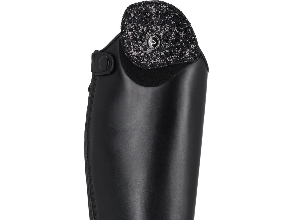 Juniorskie jeździeckie buty do jazdy konnej wykonane z wysokiej jakości skóry bydlęcej. Wygląd można dowolnie zmieniać dzięki elementowi dekoracyjnemu u góry buta.Zapinane na zamek błyskawiczny z tyłu wraz z jego ochroną i ogranicznikami ostróg. Eleganckie sznurowanie z przodu. Podstawowy wymienny element dekoracyjny jest wliczony w cenę, inne można dokupić osobno. Dostępne dla wyższej, standardowej i szerszej łydki.