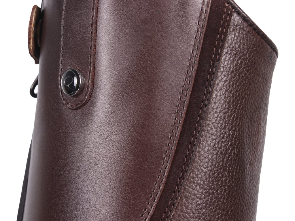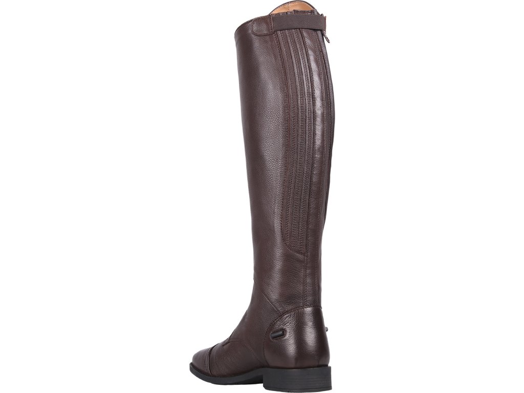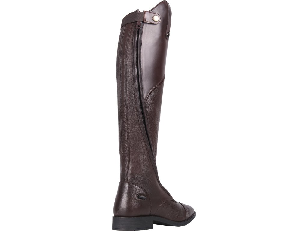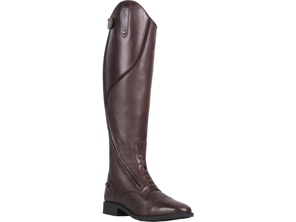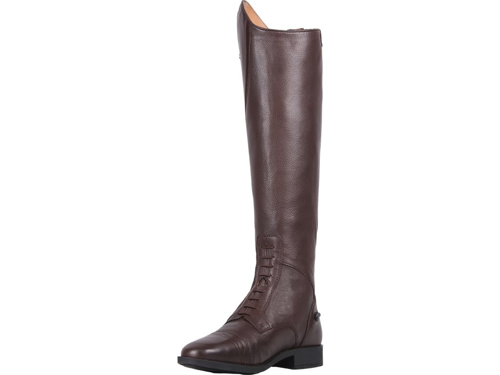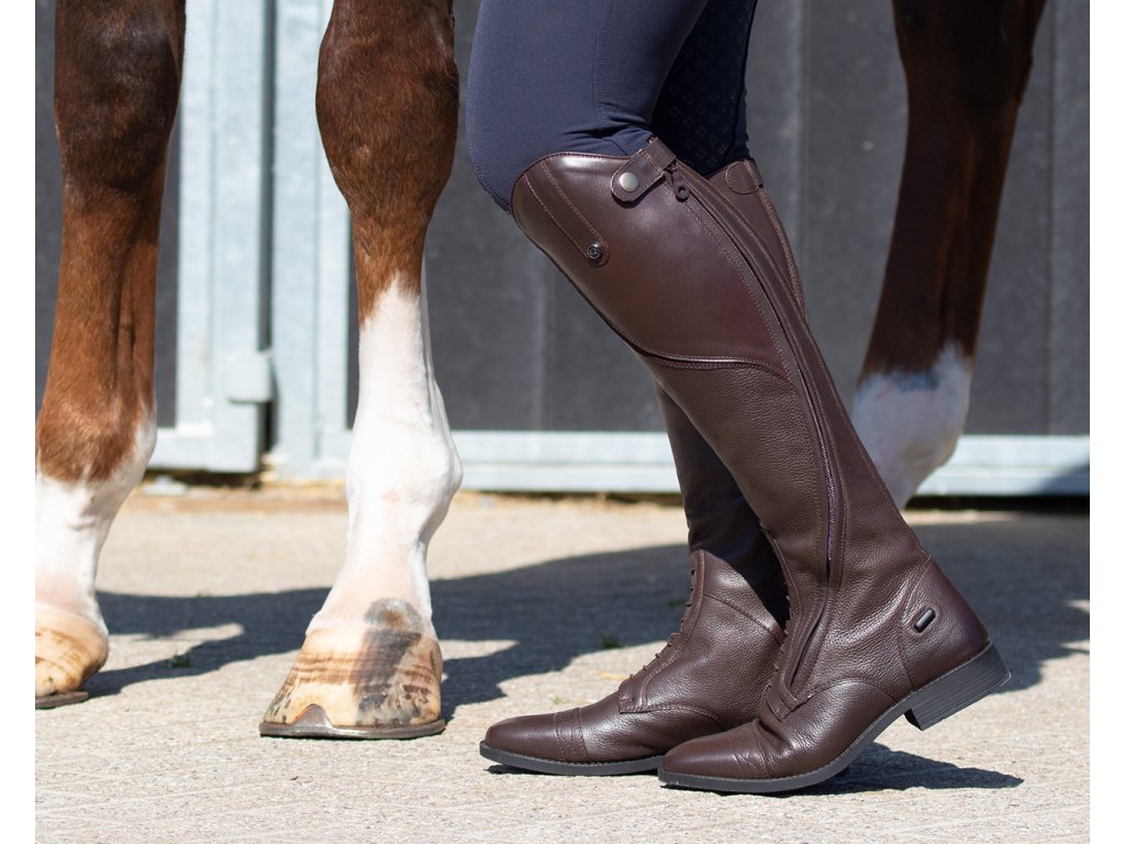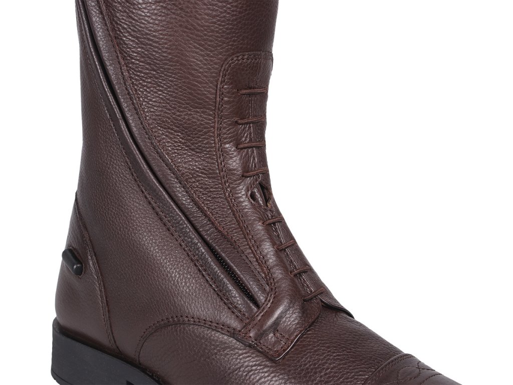Eleganckie buty jeździeckie wykonane z wysokiej jakości, elastycznej skóry. Sznurowanie wraz z elastyczną wstawką z tyłu buta zapewnia maksymalny komfort podczas chodzenia i bliski kontakt między koniem a jeźdźcem. Dodatkowe sznurowanie zapewnia swobodę ruchów kostki. Buty są wyposażone w stopki na ostrogi i ukośny zamek błyskawiczny, który jest trwały i zapewnia maksymalny komfort. Zamek błyskawiczny jest zabezpieczony guzikiem na górze. Ozdobny nosek i dekoracyjny pasek, który podkreśla wyrazisty wygląd skór, dodają elegancji. Dostępne również w kolorze czarnym oraz w rozmiarach na standardowe łydki.