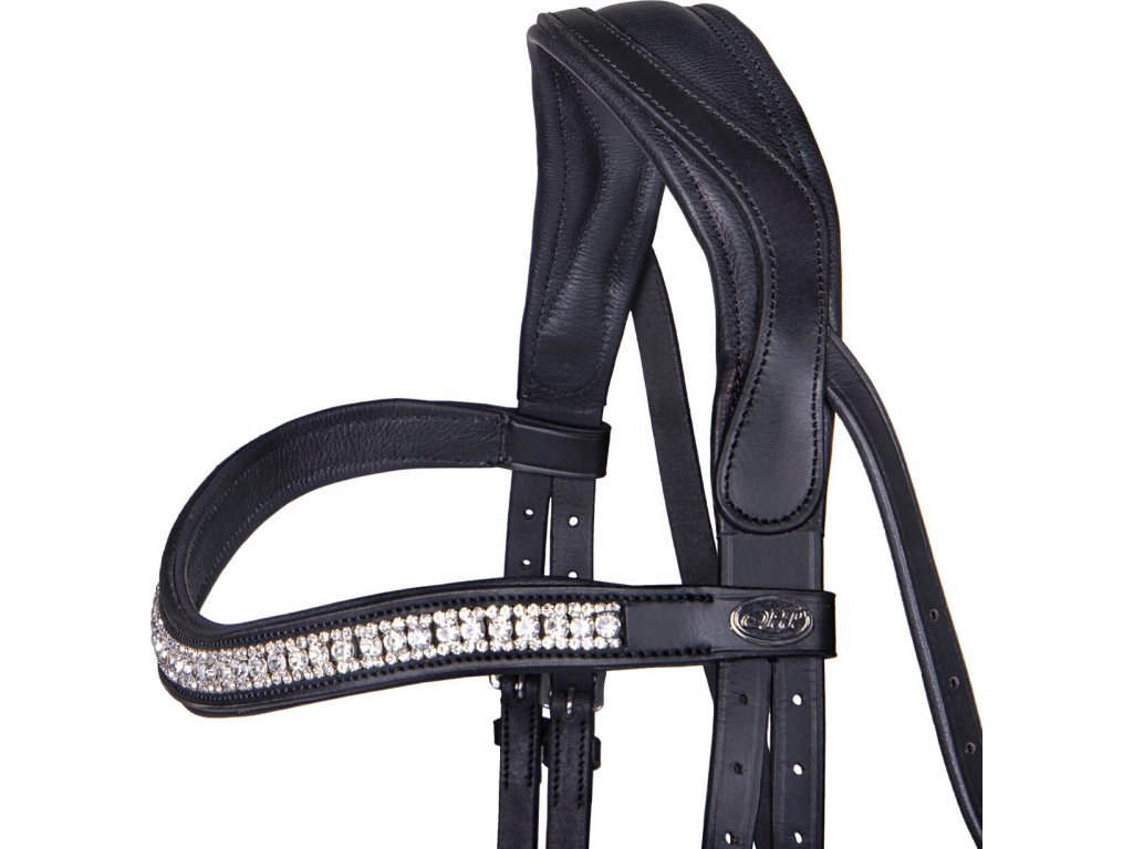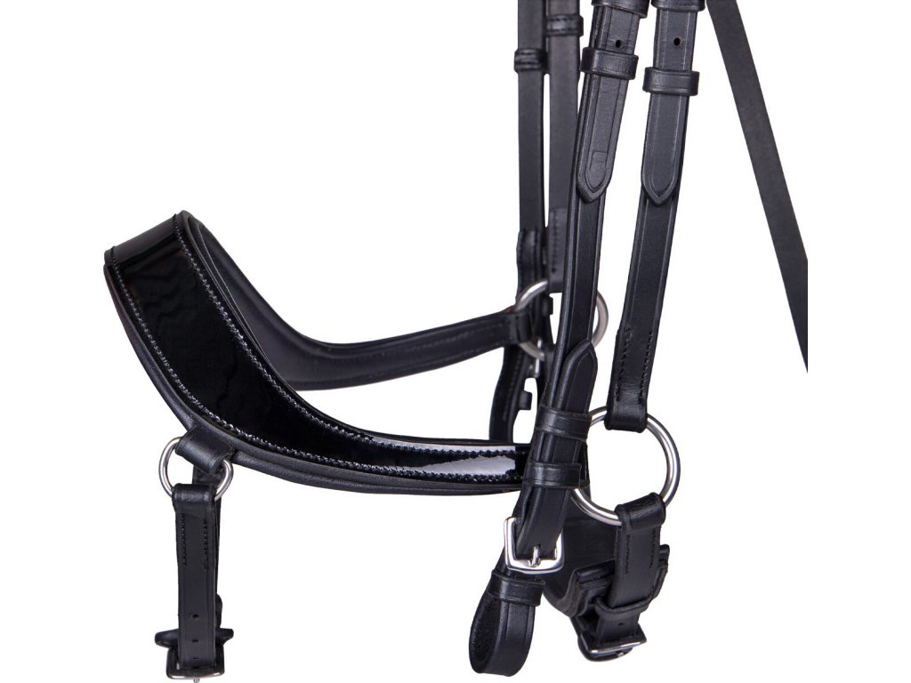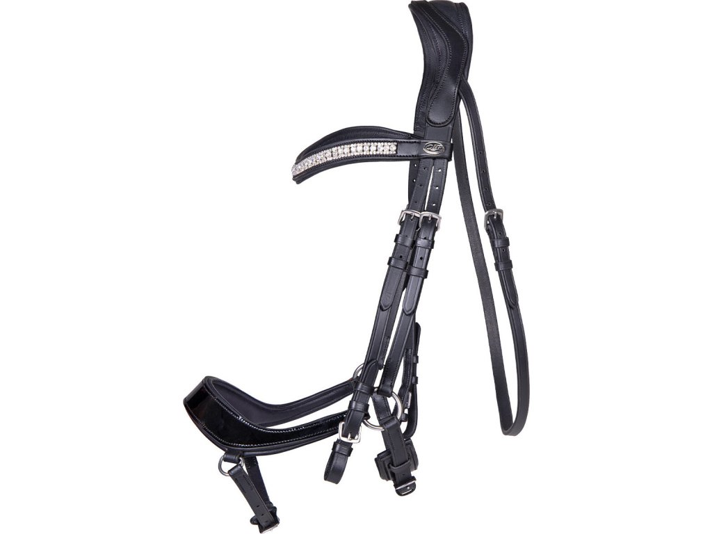 Anatomicznie ukształtowane ogłowie, które doskonale rozprowadza nacisk i omija nerwy oraz wrażliwe punkty na głowie konia. Te właściwości sprawiają, że jest odpowiednie dla wrażliwych koni. Bardzo szeroki pasek potyliczny doskonale rozkłada nacisk i zapewnia maksymalną swobodę dla uszu. Specjalny kształt nachrapnika zapewnia, że jest on umieszczony wyżej na nosie, dzięki czemu omija wrażliwą kość nosową i nie uciska zębów trzonowych. Zakrzywiony kształt naczółka omija nerwy policzkowe, zapewniając maksymalny komfort. Wyposażone w podgardle, które jest mocno przymocowane i nie można go usunąć. Całe ogłowie jest miękko wyściełane. Lakierowany nachrapnik i charakterystyczny naczółek nadają ogłowiu elegancki wygląd. Ogłowie jest dostarczane wraz z wodzami.