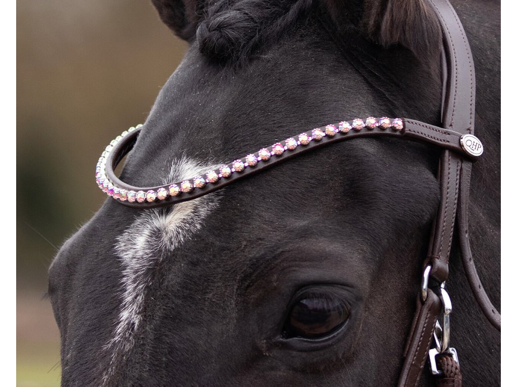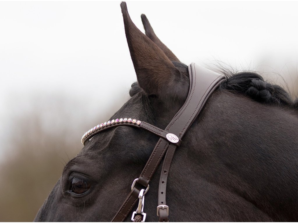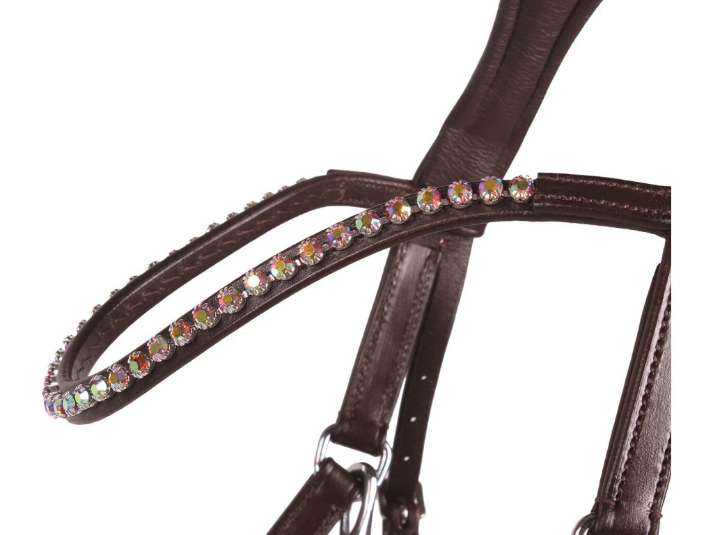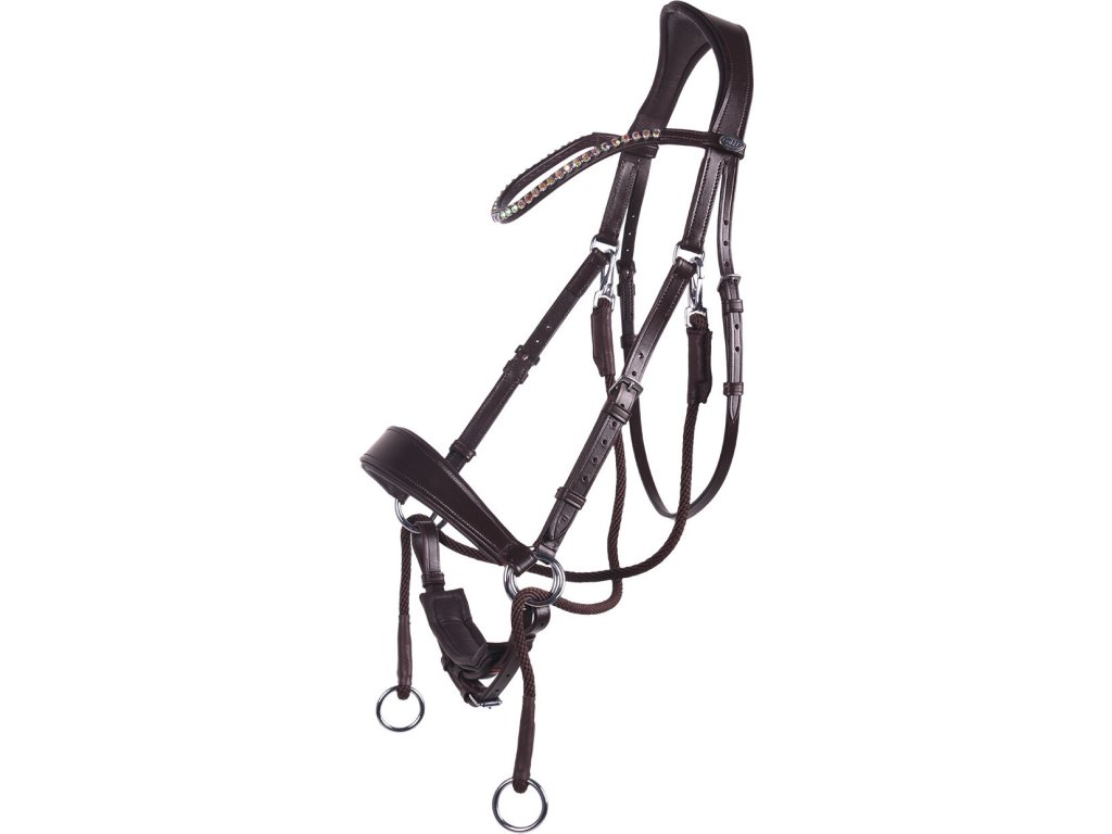 Anatomicznie ukształtowane, wielofunkcyjne uzda bezwędzidłowe, które można używać na kilka sposobów. Ozdobione błyszczącymi cyrkoniami w różnych kolorach. Anatomiczny nagłówek zmniejsza nacisk wokół uszu. Ogłowie ma miękkie wyściełanie dla maksymalnego komfortu. Wyposażone w szeroki nachrapnik, podwójne zapięcie i klipsy na paskach i wodzach dla łatwej regulacji rozmiaru. Część pod brodą można odłączyć. Pasujące wodze w zestawie.