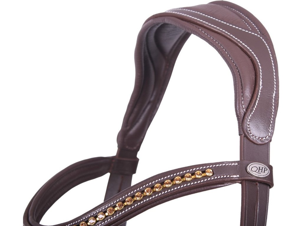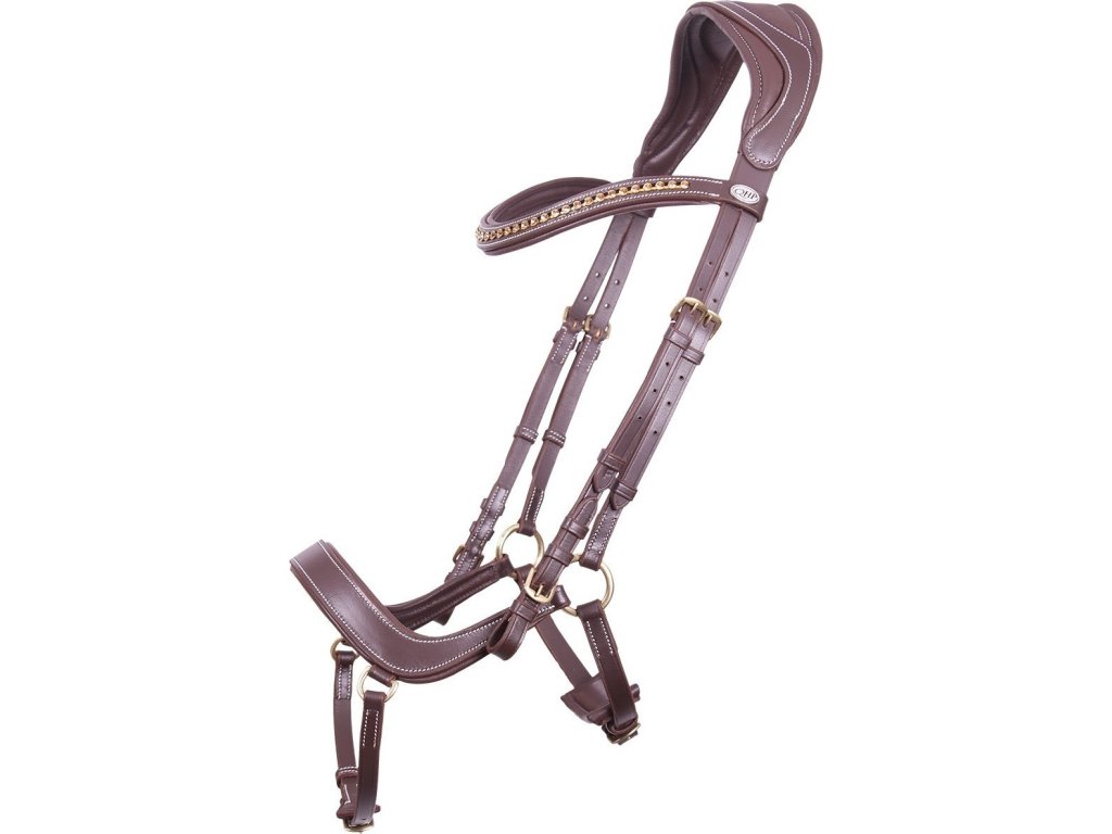 Anatomicznie ukształtowane ogłowie z miękkim podszyciem, które w jak największym stopniu omija wrażliwe punkty na głowie konia. Dzięki temu ogłowie jest odpowiednie dla koni wyjątkowo wrażliwych. Specjalnie zaprojektowany, zakrzywiony kształt nachrapnika zapewnia, że leży on wyżej na nosie i omija wrażliwą dolną część. Anatomiczny pasek potyliczny zapewnia maksymalną swobodę uszu i równomiernie rozkłada nacisk. Dodatkowo nie uciska zębów konia, zapobiegając podrażnieniom w pysku. Ogłowie jest ozdobione białymi przeszyciami i błyszczącym naczółkiem w kształcie fali ze złotymi cyrkoniami. W zestawie znajdują się również wodze.