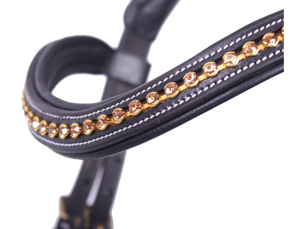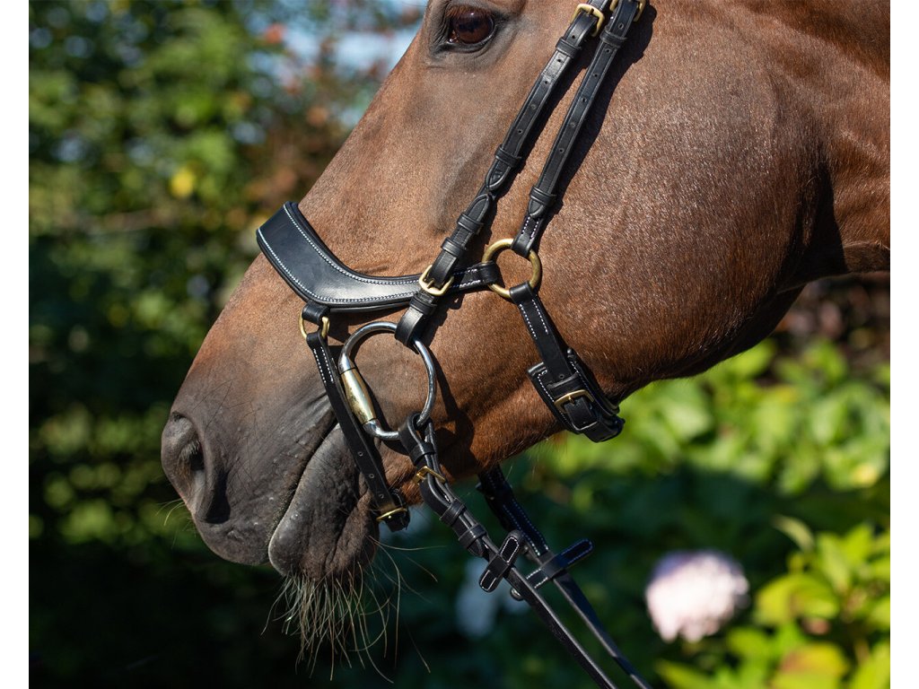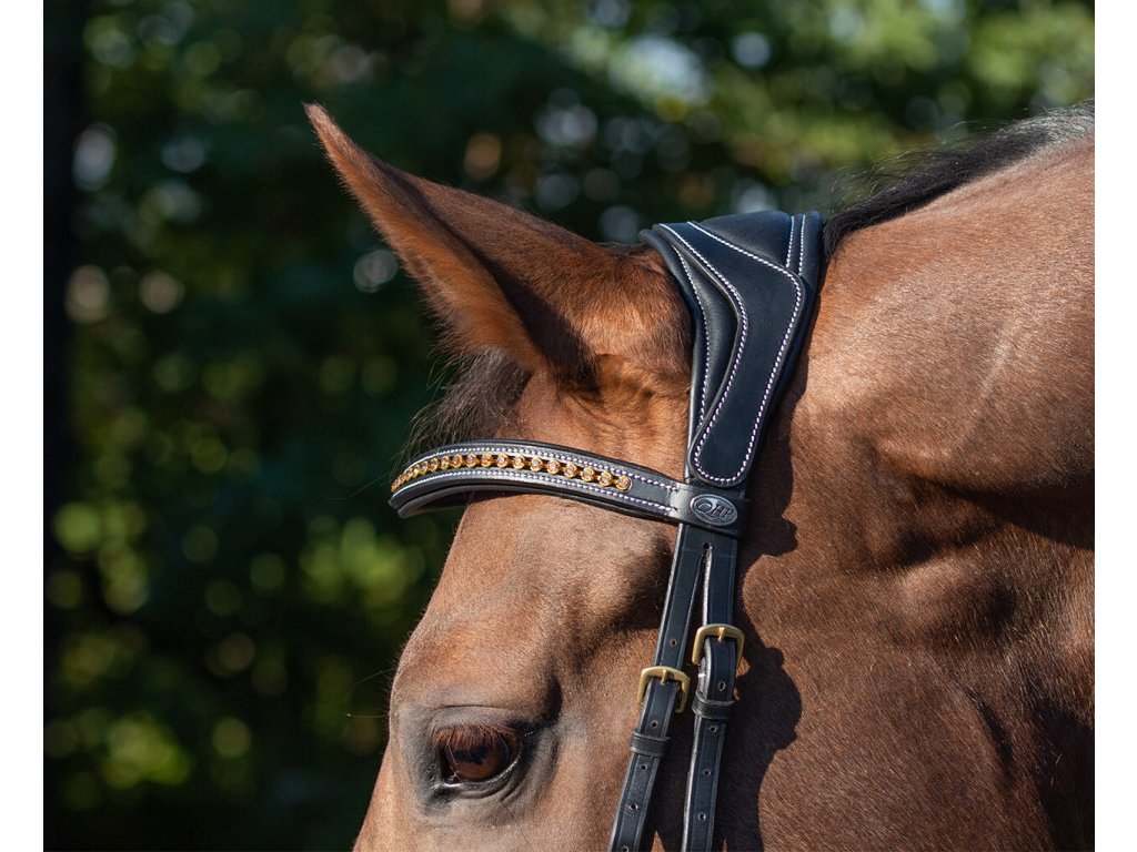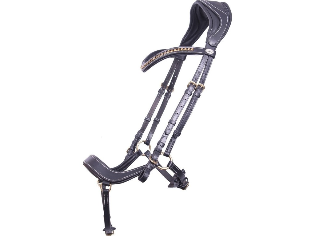 Anatomicznie ukształtowane ogłowie z miękkim podszyciem, które w jak największym stopniu omija wrażliwe punkty na głowie konia. Dzięki temu ogłowie jest odpowiednie dla koni wyjątkowo wrażliwych. Specjalnie zaprojektowany, zakrzywiony kształt nachrapnika zapewnia, że leży on wyżej na nosie i omija wrażliwą dolną część. Anatomiczny pasek potyliczny zapewnia maksymalną swobodę uszu i równomiernie rozkłada nacisk. Dodatkowo nie uciska zębów konia, zapobiegając podrażnieniom w pysku. Ogłowie jest ozdobione białymi przeszyciami i błyszczącym naczółkiem w kształcie fali ze złotymi cyrkoniami. W zestawie znajdują się również wodze.
