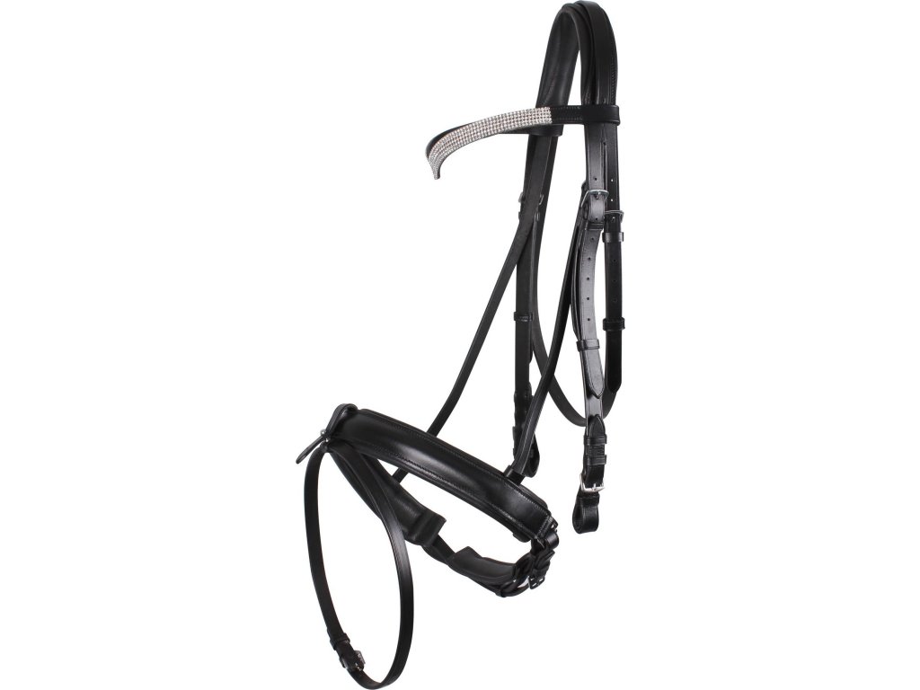 Eleganckie ogłowie z skóry z regulowanym szwedzkim nachrapnikiem kombinowanym. Piękny naczółek w kształcie litery V ozdobiony srebrnymi, błyszczącymi cyrkoniami, aby wizualnie zmniejszyć rozmiar głowy i zwiększyć elegancję. W zestawie z wodzami. W kolorze czarnym.