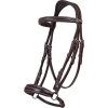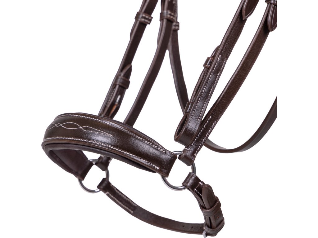 Wysokiej jakości skórzane ogłowie z nachrapnikiem hanowerskim i anatomicznie ukształtowanym paskiem potylicznym. Wykończone profilowanym naczółkiem z subtelnymi przeszyciami. Miękka wyściółka w obszarze nachrapnika i paska potylicznego zapewnia maksymalny komfort. Dostępne w kolorze czarnym i brązowym oraz w kilku rozmiarach.