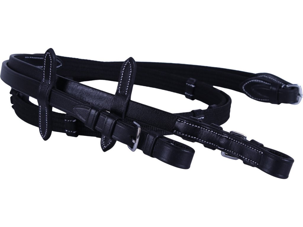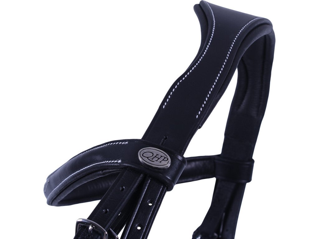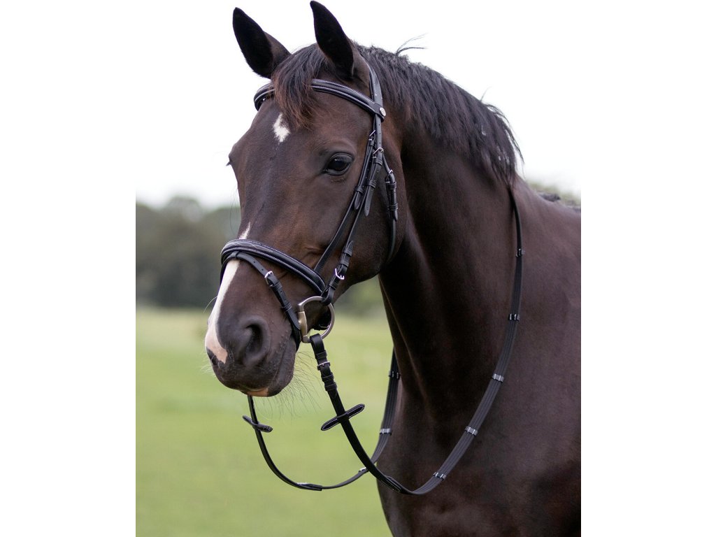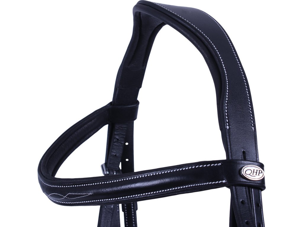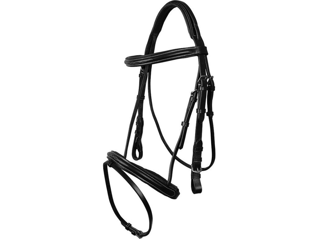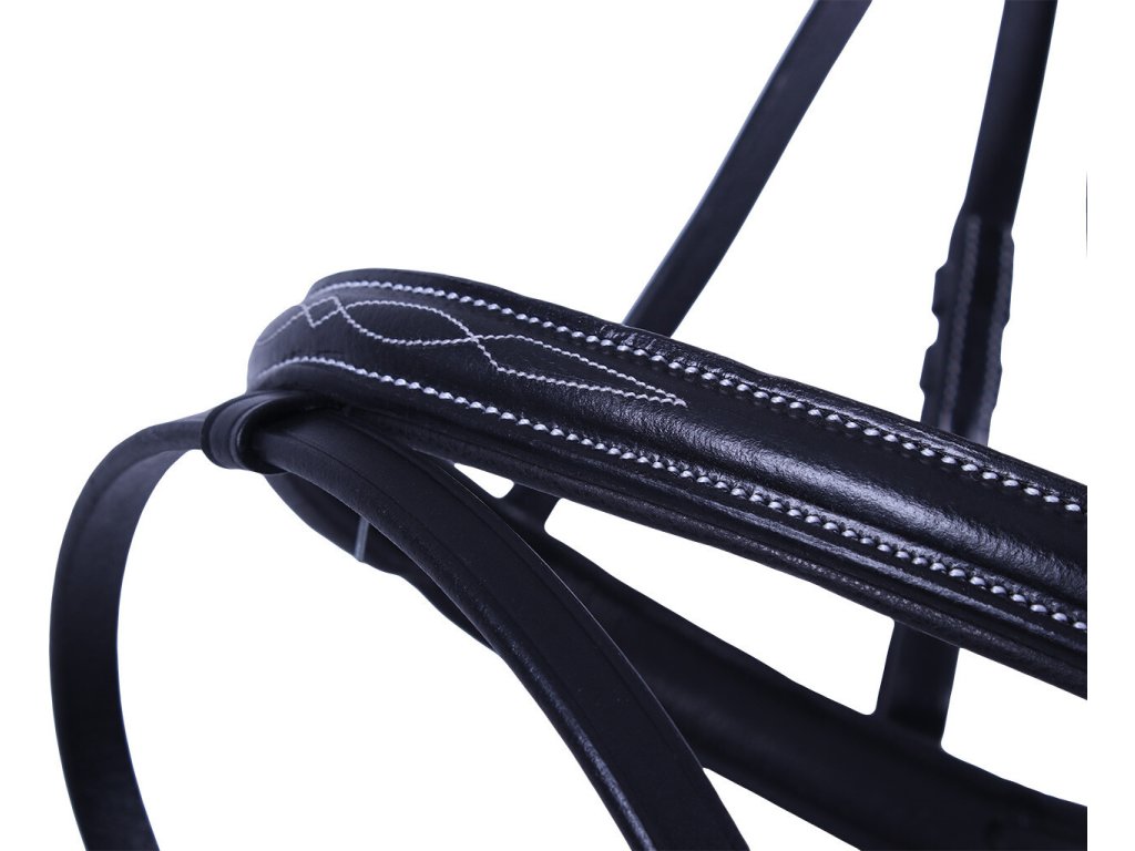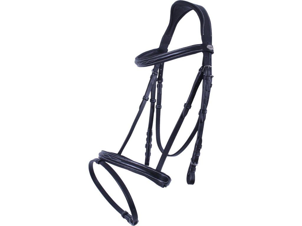 Luksusowy ogłowie ozdobione białymi szwami i angielskim kombinowanym nachrapnikiem. Posiada miękkie podszycie na nachrapniku i potylicy. Dostarczane z wodzami z białymi przeszyciami. Dostępne w kolorze brązowym i czarnym.
