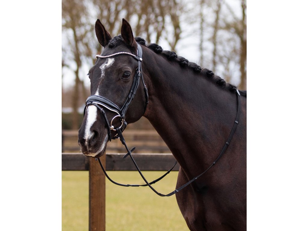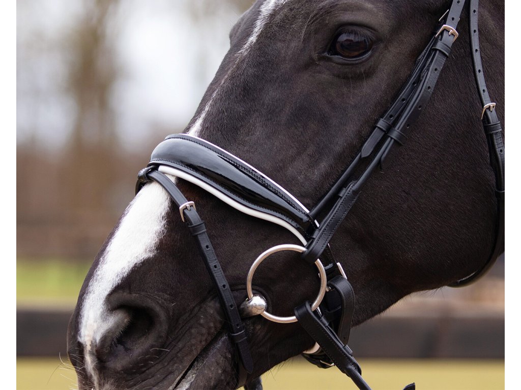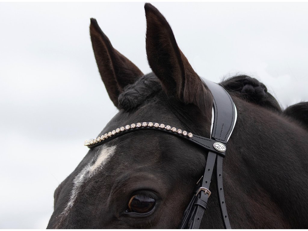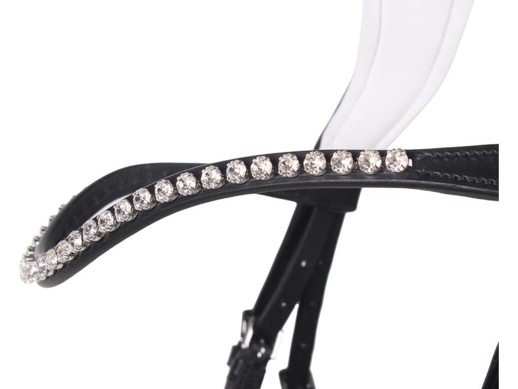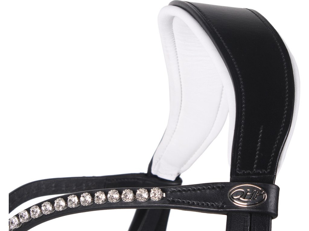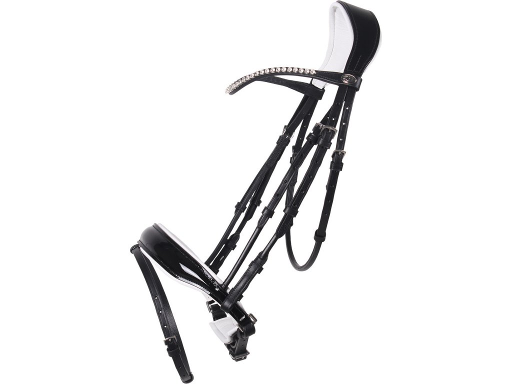 Ogłowie Nehza wykonane z wysokiej jakości skóry. Posiada szeroki, anatomicznie ukształtowany pasek potyliczny i miękkie podszycie, które zapewnia maksymalny komfort. Specjalnie ukształtowany nachrapnik zapewnia optymalną przestrzeń dla wędzidła. Ogłowie jest ozdobione lakierowaną skórą na nachrapniku i błyszczącymi cyrkoniami na naczółku. Dostarczane z wodzami. Dostępne w kolorze czarnym z czarnym lub białym podszyciem.