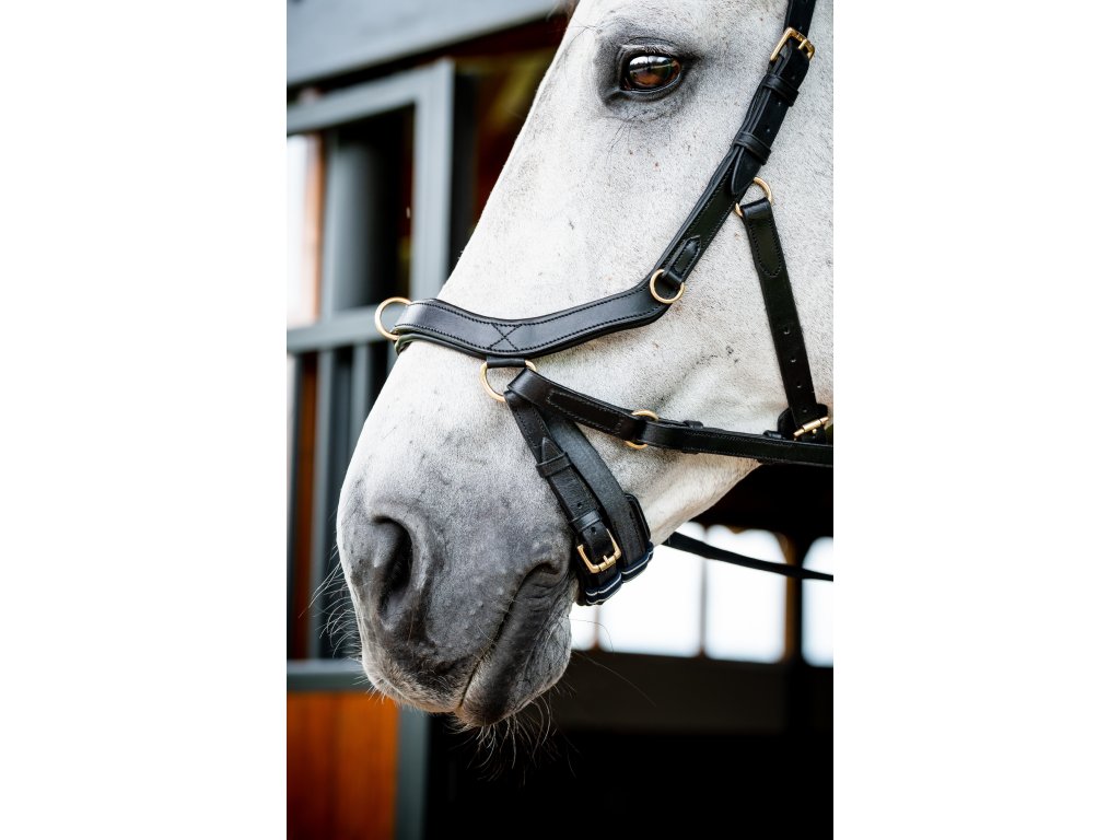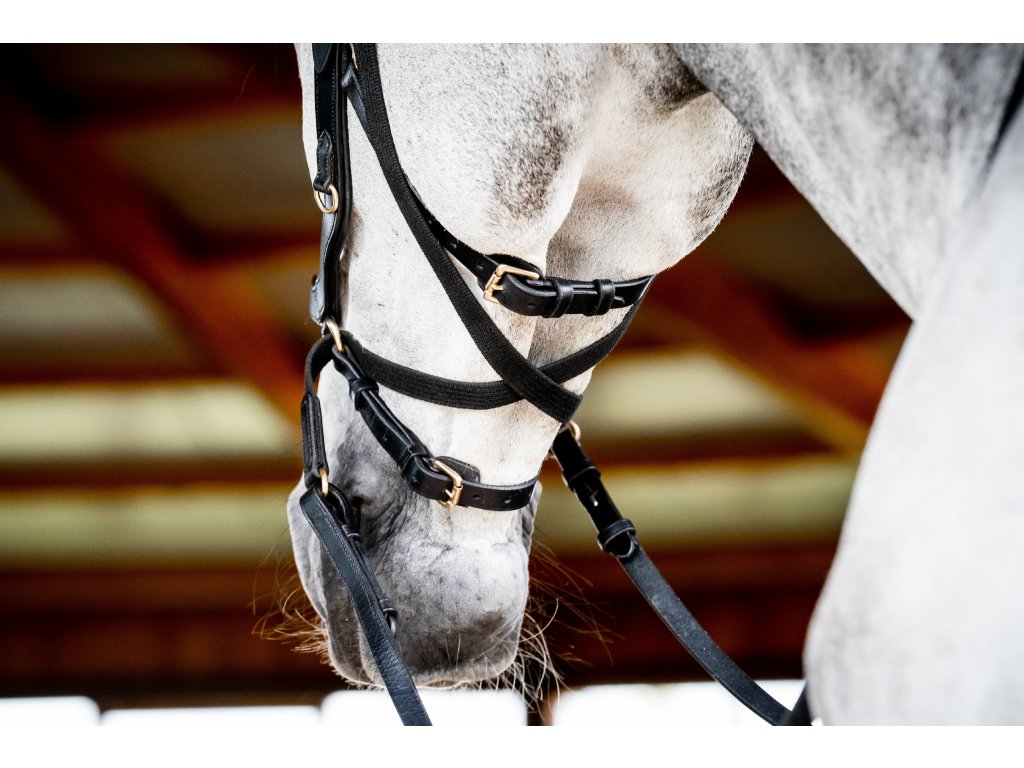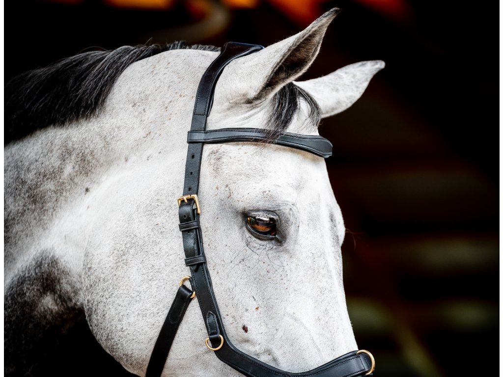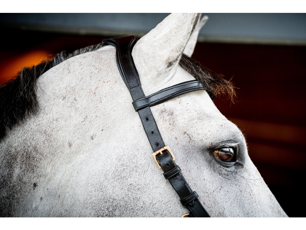 - Wyprofilowany i miękko wyściełany pasek potyliczny , równomiernie rozprowadzający nacisk dzięki swojej szerokości. Bez bezpośredniego połączenia z nachrapnikiem. Następnie pasek potyliczny zwęża się ku dołowi, aby zapobiec naciskowi na uszy.