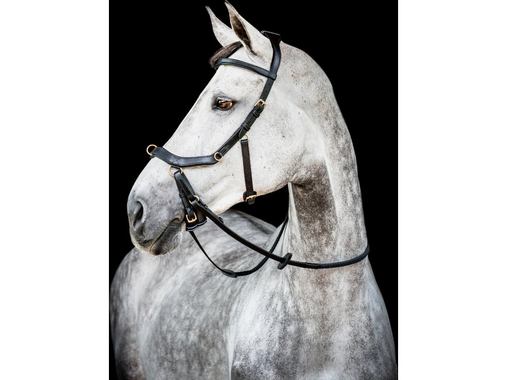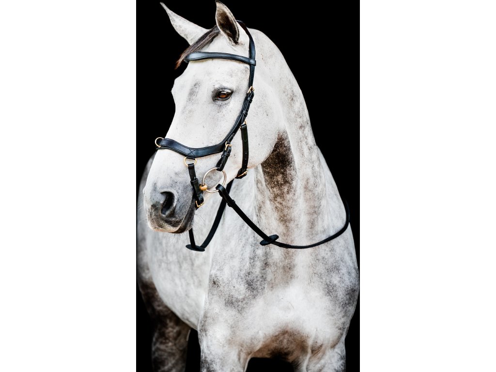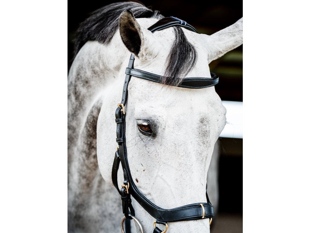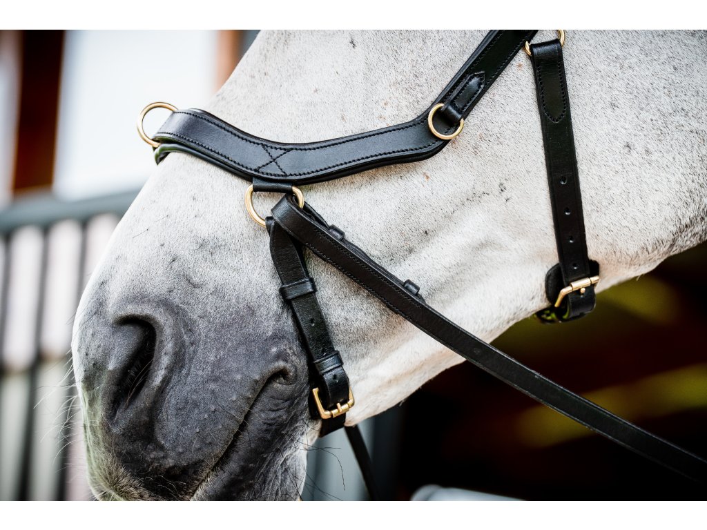 - Wyprofilowany i miękko wyściełany pasek potyliczny , równomiernie rozprowadzający nacisk dzięki swojej szerokości. Bez bezpośredniego połączenia z nachrapnikiem. Następnie pasek potyliczny zwęża się ku dołowi, aby zapobiec naciskowi na uszy.
