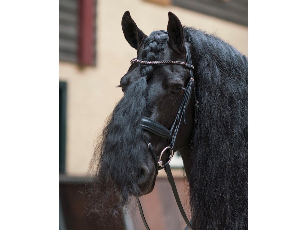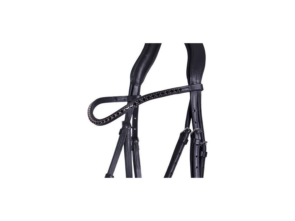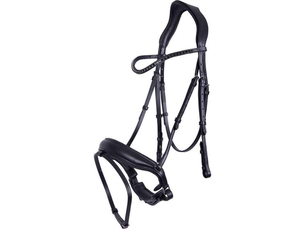 Luksusowe skórzane ogłowie ze szwedzkim kombinowanym nachrapnikiem. Posiada miękko wyściełany i anatomicznie ukształtowany nachrapnik oraz pasek potyliczny. Cienki naczółek, w kształcie fali, ozdobiony błyszczącymi czarnymi cyrkoniami. Okucia są wykonane ze stali nierdzewnej, a w zestawie znajdują się wodze.