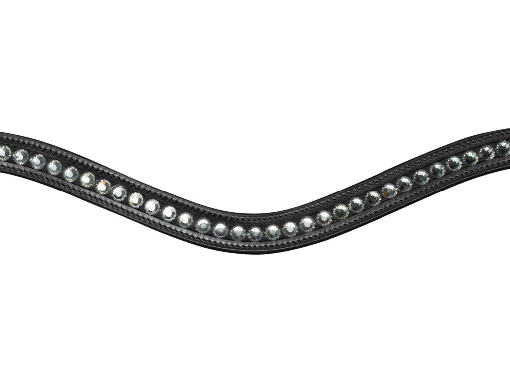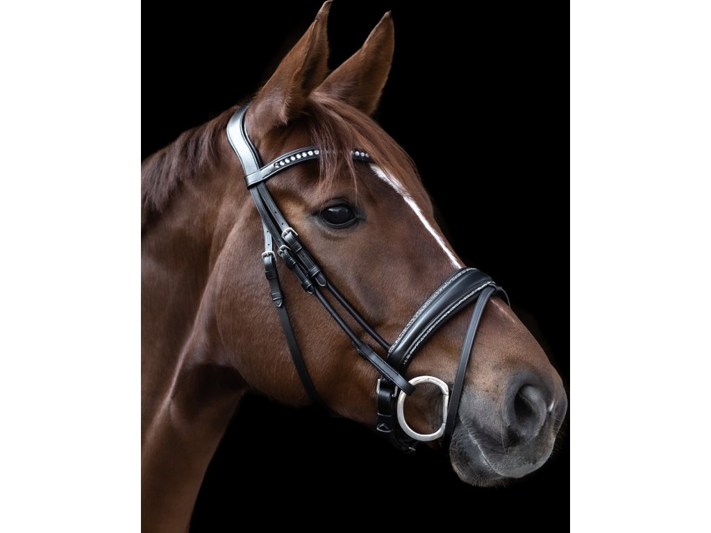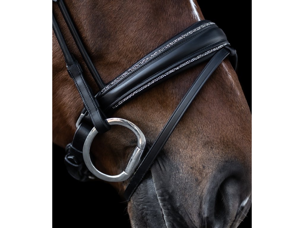 Wysokiej jakości ogłowie S-line o interesującym, eleganckim kroju. Posiada angielski kombinowany nachrapnik i pasek potyliczny zapewniający wystarczający prześwit na uszy, który ma dodatkowe miękkie wyściełanie. Ogłowie jest ozdobione zakrzywionym naczółkiem z miękkim wyściełaniem i subtelnymi srebrnymi cyrkoniami pośrodku. Paski policzkowe i nachrapnika mają okrągły kształt. Wyposażone w okucia ze stali nierdzewnej. Nachrapnik jest ozdobiony subtelną, błyszczącą dekoracją. Dostarczane z wodzami o szerokości 19 mm.