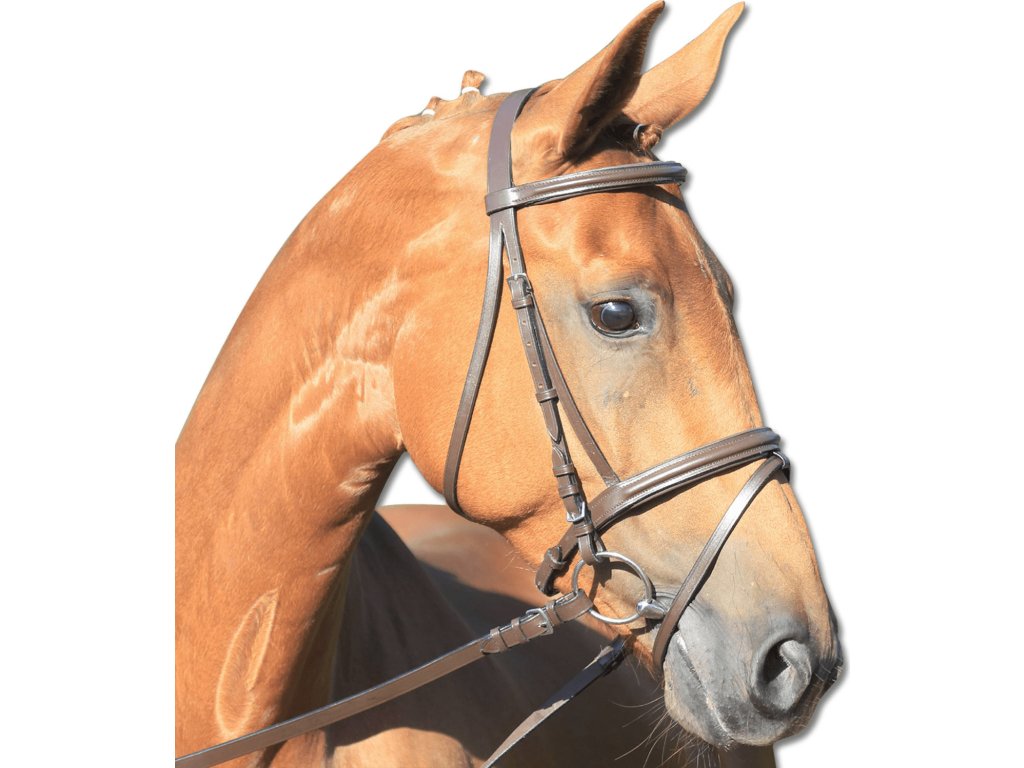 Skórzane ogłowie z nachrapnikiem kombinowanym angielskim w kolorze brązowym. Lekko wyściełany pasek potyliczny i nachrapnik. Liniowe podgardle i pasek potyliczny, niklowane żelazne połączenie. Szerokość wodzy dla MSH i SH 16 mm, dla pozostałych 19 mm. Świetny stosunek jakości do ceny.